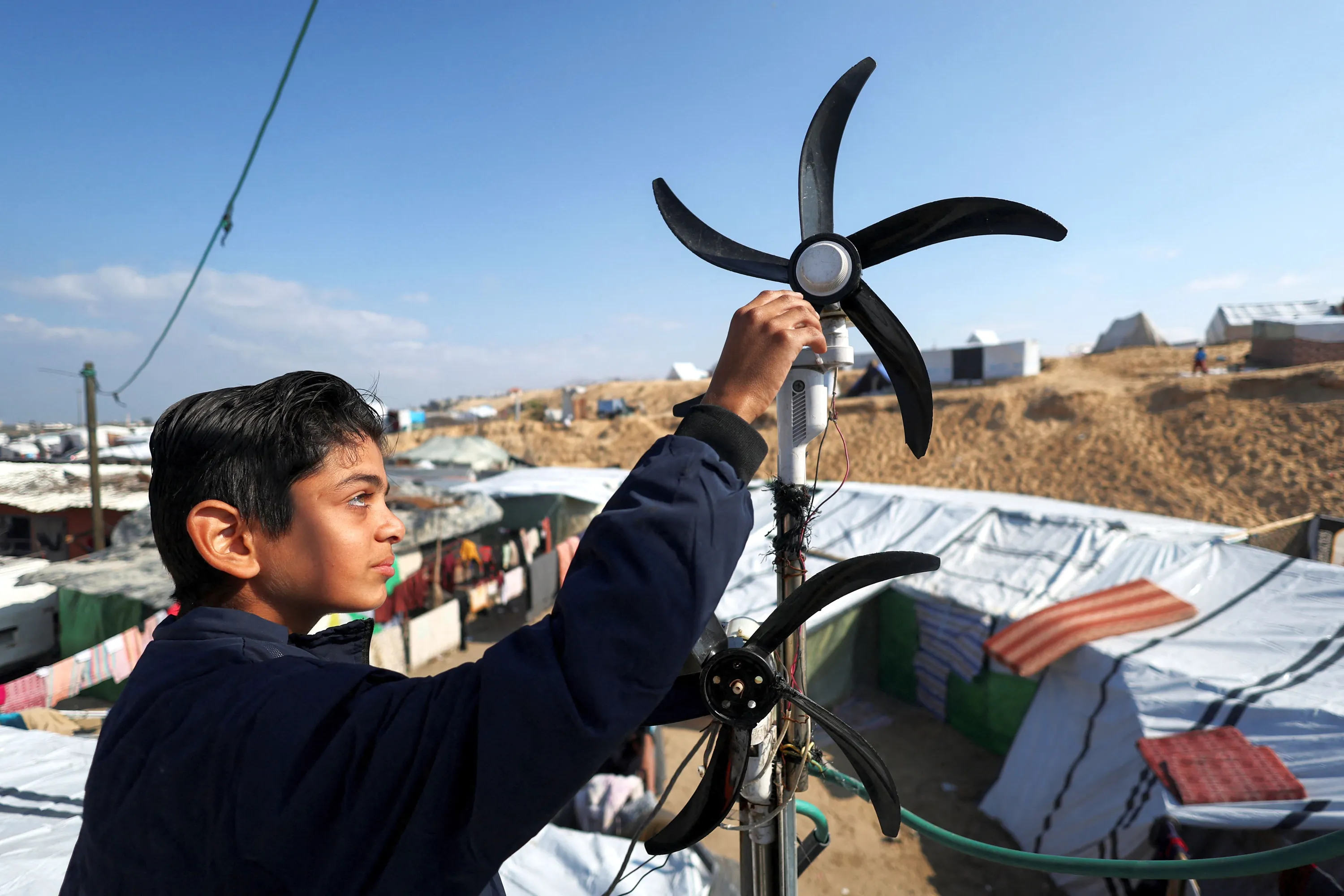 Displaced Palestinian teenager Hussam Al-Attar, nicknamed by people 'Newton', works on wind turbines, that he uses to light up his shelter during power cut, at a tent camp in Rafah, in the southern Gaza Strip, on February 6, 2024. (Photo by Ibraheem Abu Mustafa/Reuters)