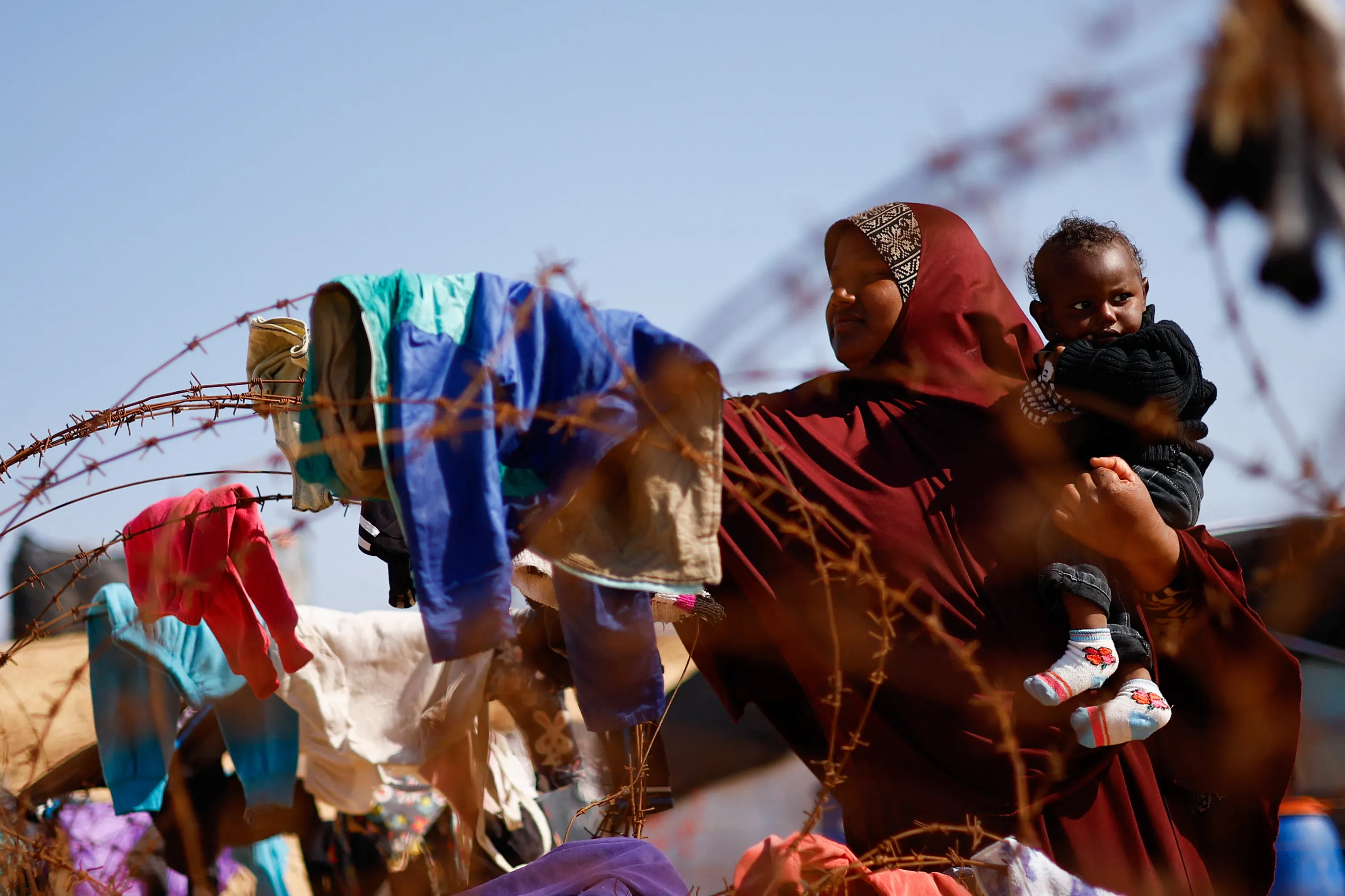 A woman holds a child, as displaced Palestinians, who fled their houses due to Israeli strikes, take shelter in a tent camp, amid the ongoing conflict between Israel and Hamas, at the border with Egypt, in Rafah in the southern Gaza Strip, on February 7, 2024. (Photo by Ibraheem Abu Mustafa/Reuters)