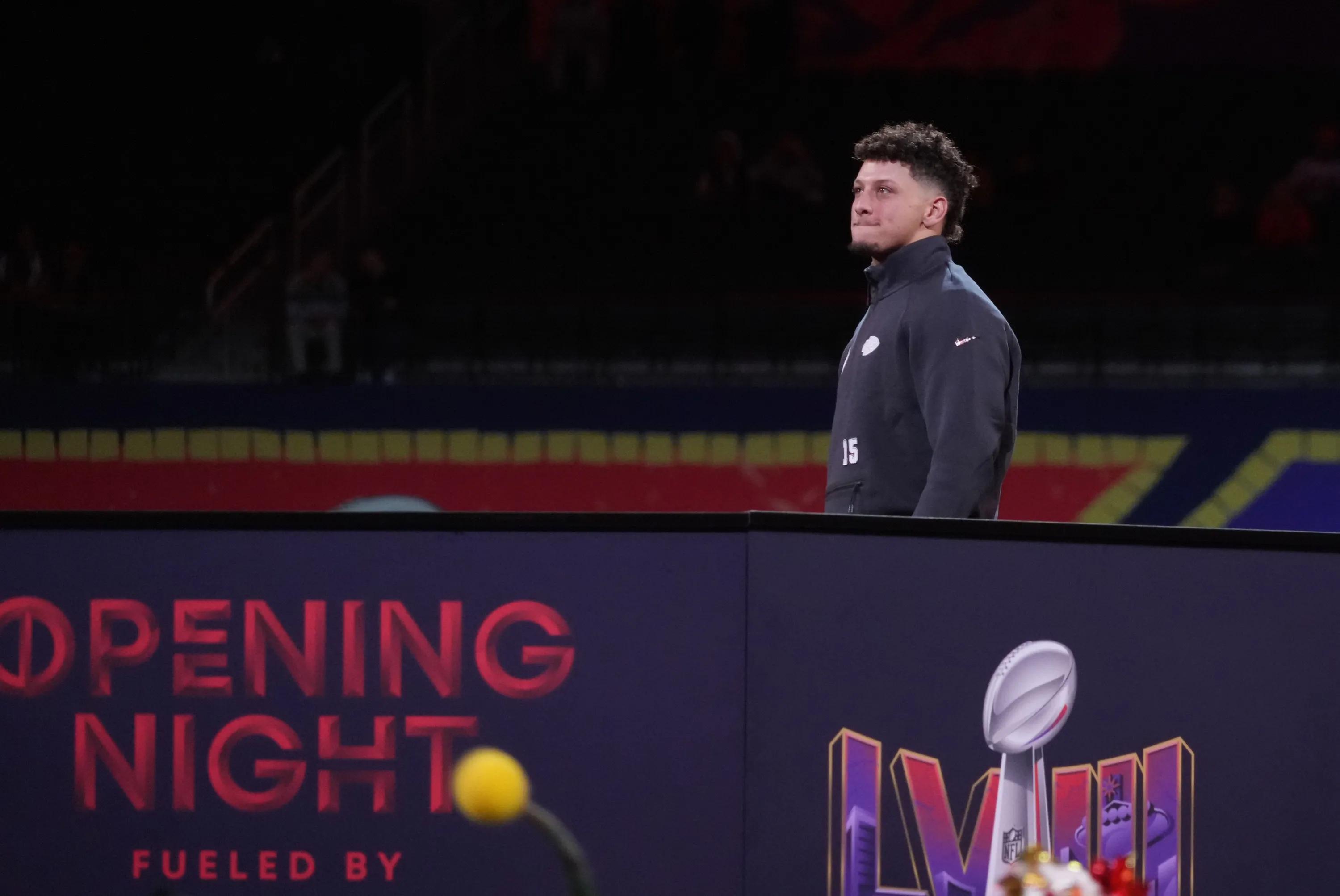 Kansas City Chiefs quarterback Patrick Mahomes walks on stage during Super Bowl LVIII Opening Night in Las Vegas on February 6, 2024. (Photo by Kirby Lee/USA TODAY Sports)