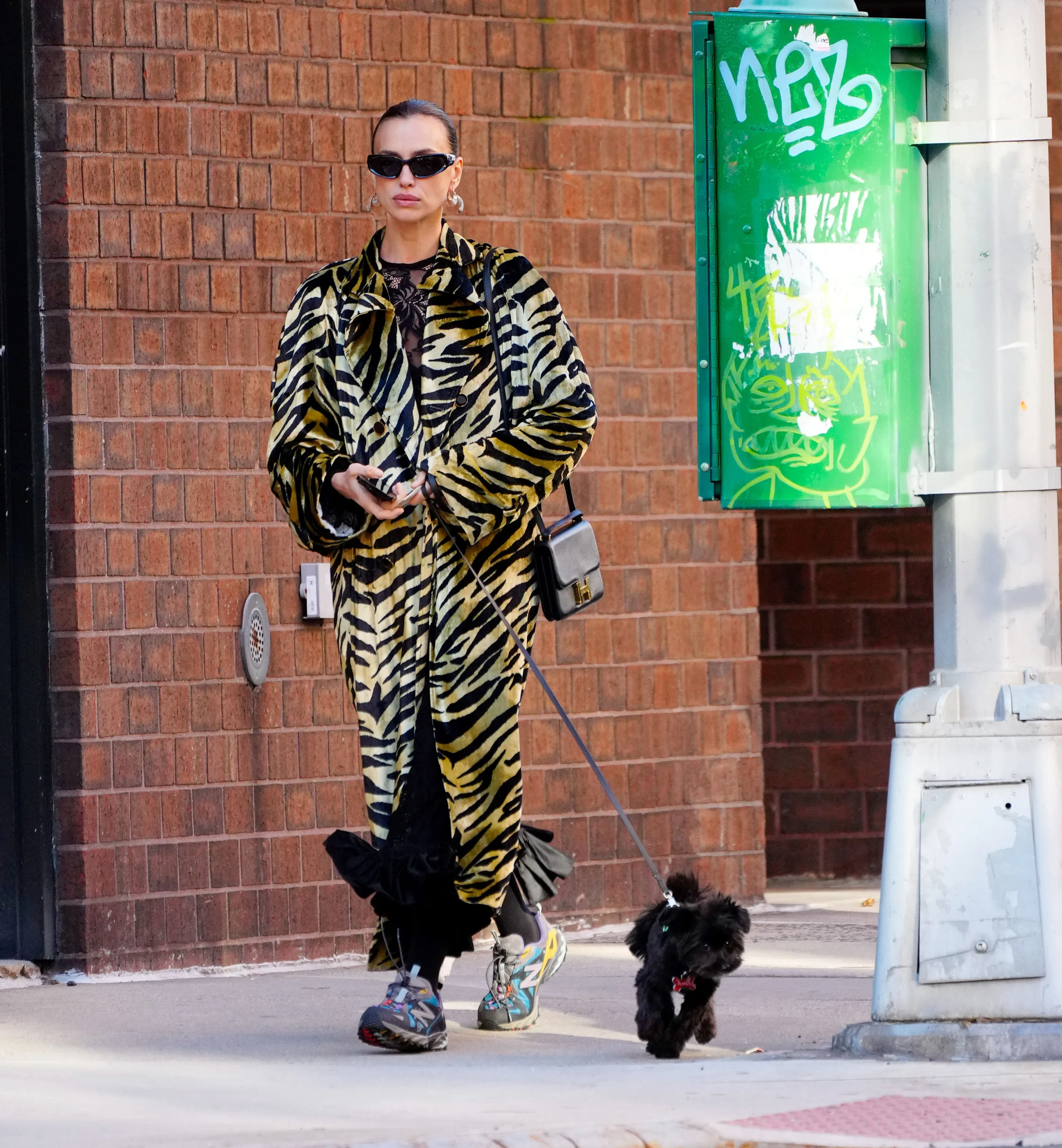 Irina Shayk and daughter Lea walk with their dog in New York City on February 6, 2024. The Russian supermodel wore a tige print trench coat, and colorful New Balance trainers. (Photo by The Image Direct)