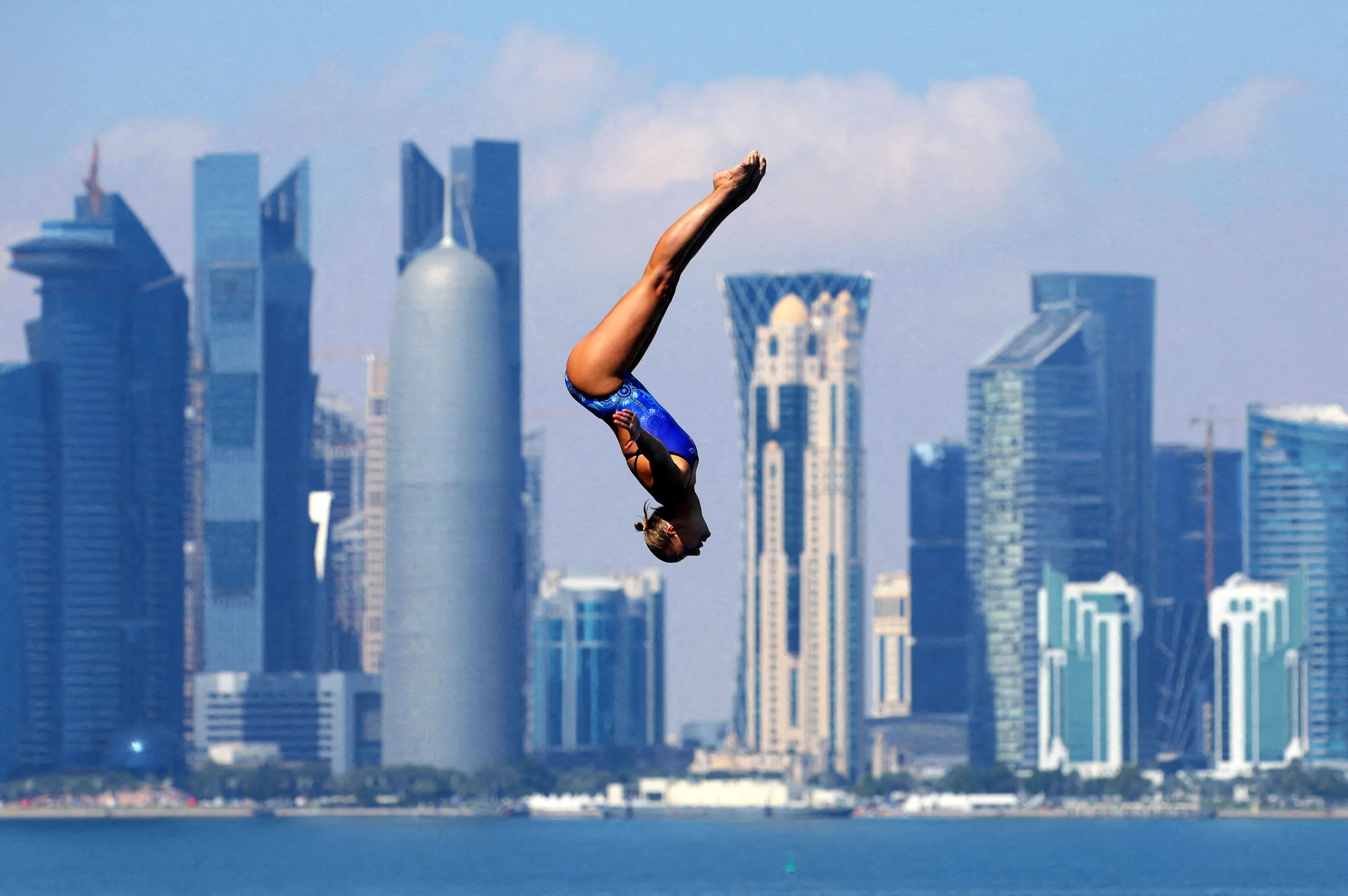 Australia’s Rhiannan Iffland competes in the preliminary round of the women's 20m high diving event during the 2024 World Aquatics Championships at Doha Port in Doha on February 13, 2024. (Photo by Evgenia Novozhenina/Reuters)
