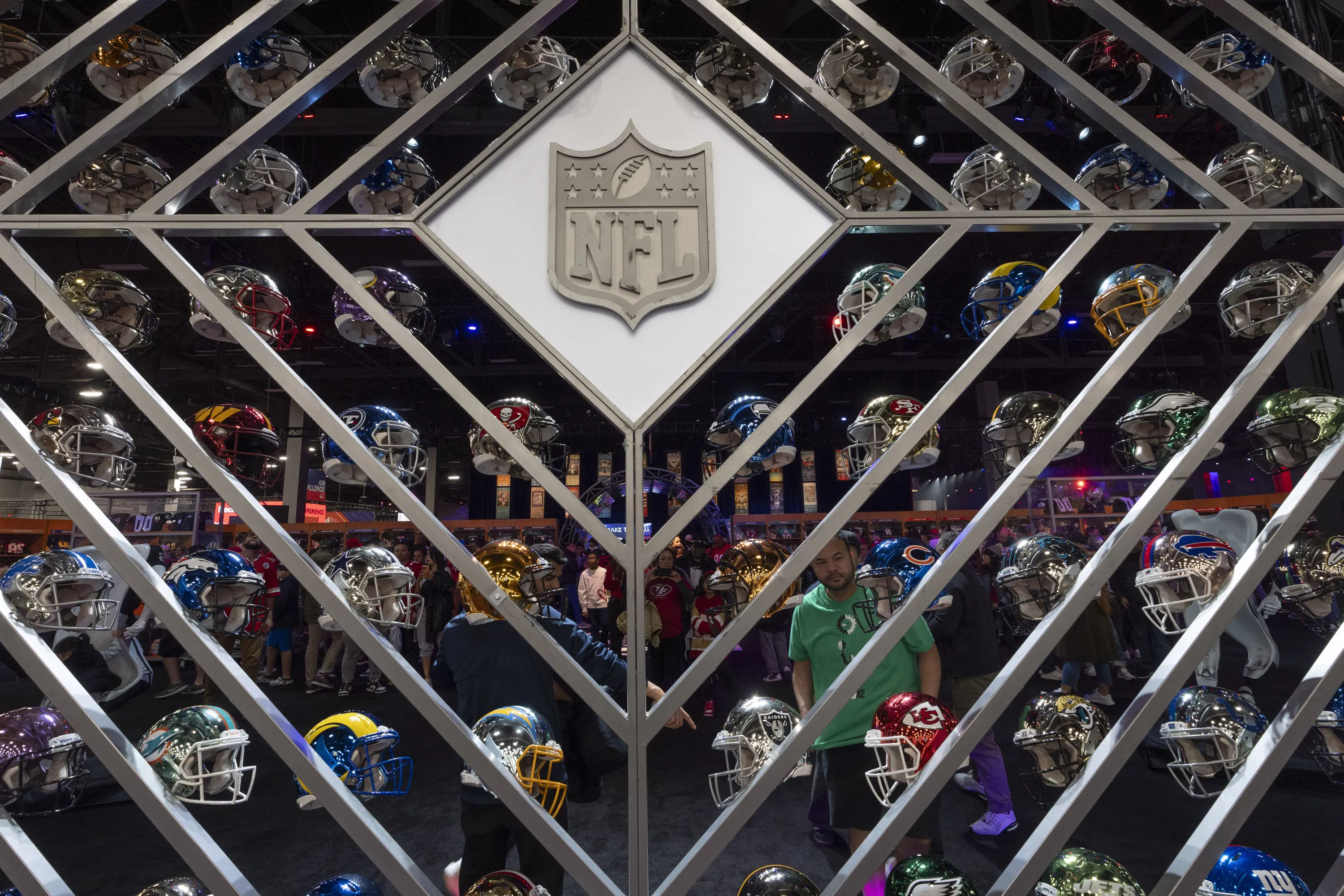 A man looks at a wall of helmets during NFL Experience ahead of Super Bowl 58, Saturday, February 10, 2024, in Las Vegas. The Kansas City Chiefs will play the NFL football game against the San Francisco 49ers Sunday. (Photo by Gregory Bull/AP Photo)
