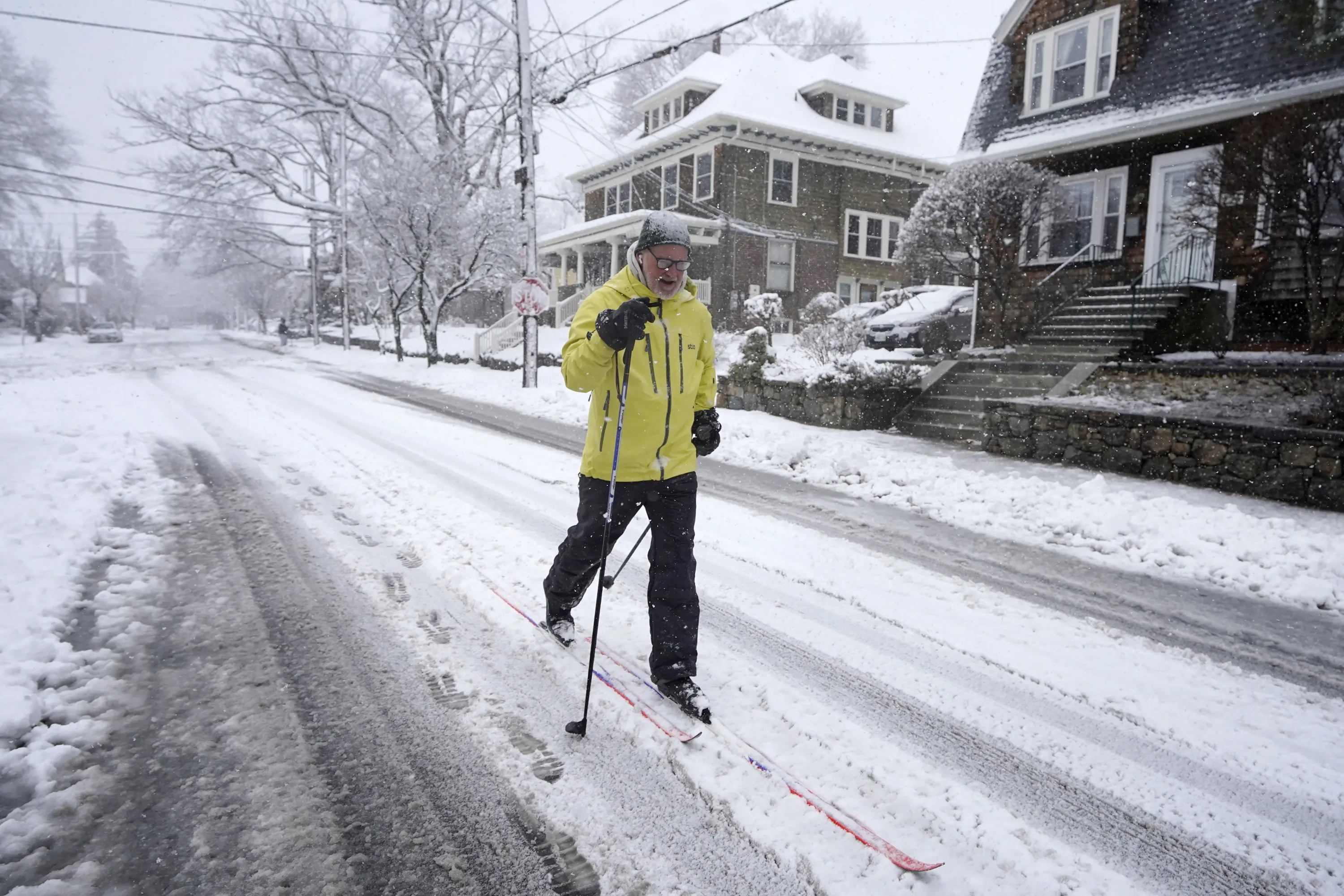Nelson Taylor, of Providence, R.I., uses cross-country skis while making his way along a residential street, Tuesday, February 13, 2024, in Providence. Parts of the Northeast have been hit by a coastal storm that's dumping snow and packing strong winds in some areas, while others aren't getting as much snow as anticipated. (Photo by Steven Senne/AP Photo)