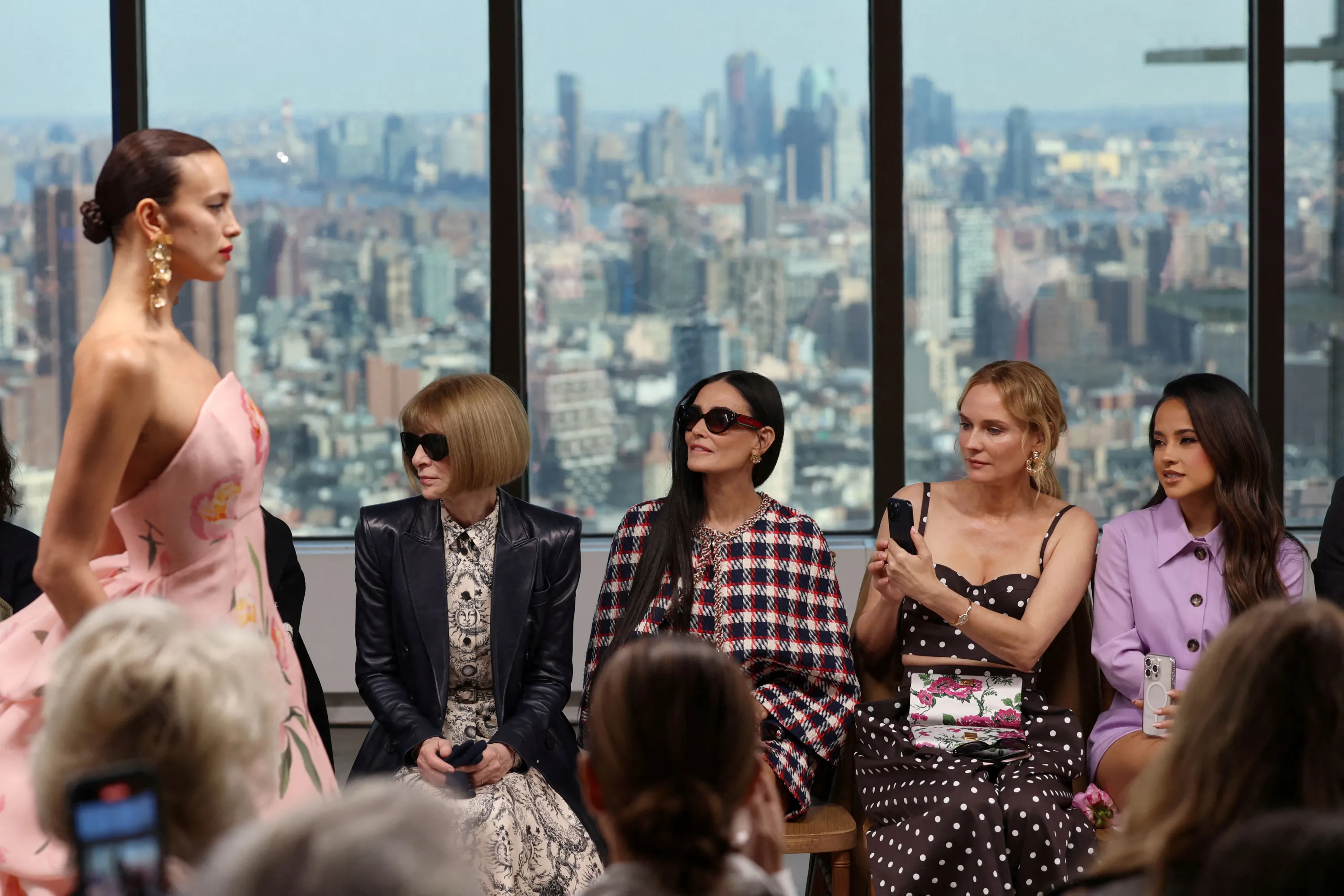 Model Irina Shayk presents a creation from the Carolina Herrera Fall/Winter 2024 collection as Vogue Editor-in-Chief Anna Wintour, Demi Moore, Diane Kruger and Becky G attend the show during New York Fashion Week, in New York City, U.S., February 12, 2024. (Photo by Andrew Kelly/Reuters)