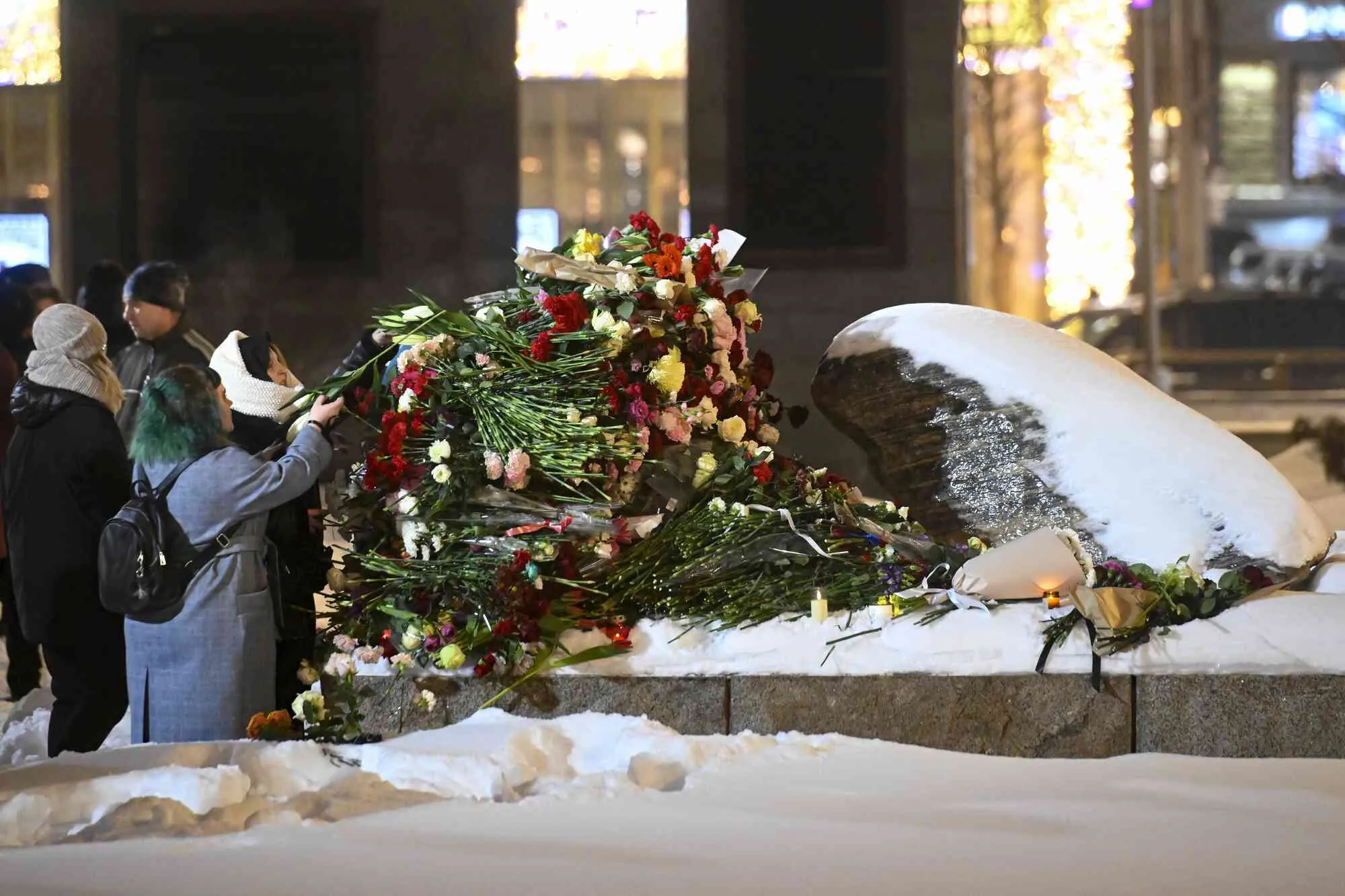 People lay flowers paying respect to Alexei Navalny at the monument, a large boulder from the Solovetsky islands, where the first camp of the Gulag political prison system was established, in Moscow, Russia, Friday, February 16, 2024. (Photo by Dmitry Serebryakov/AP Photo)
