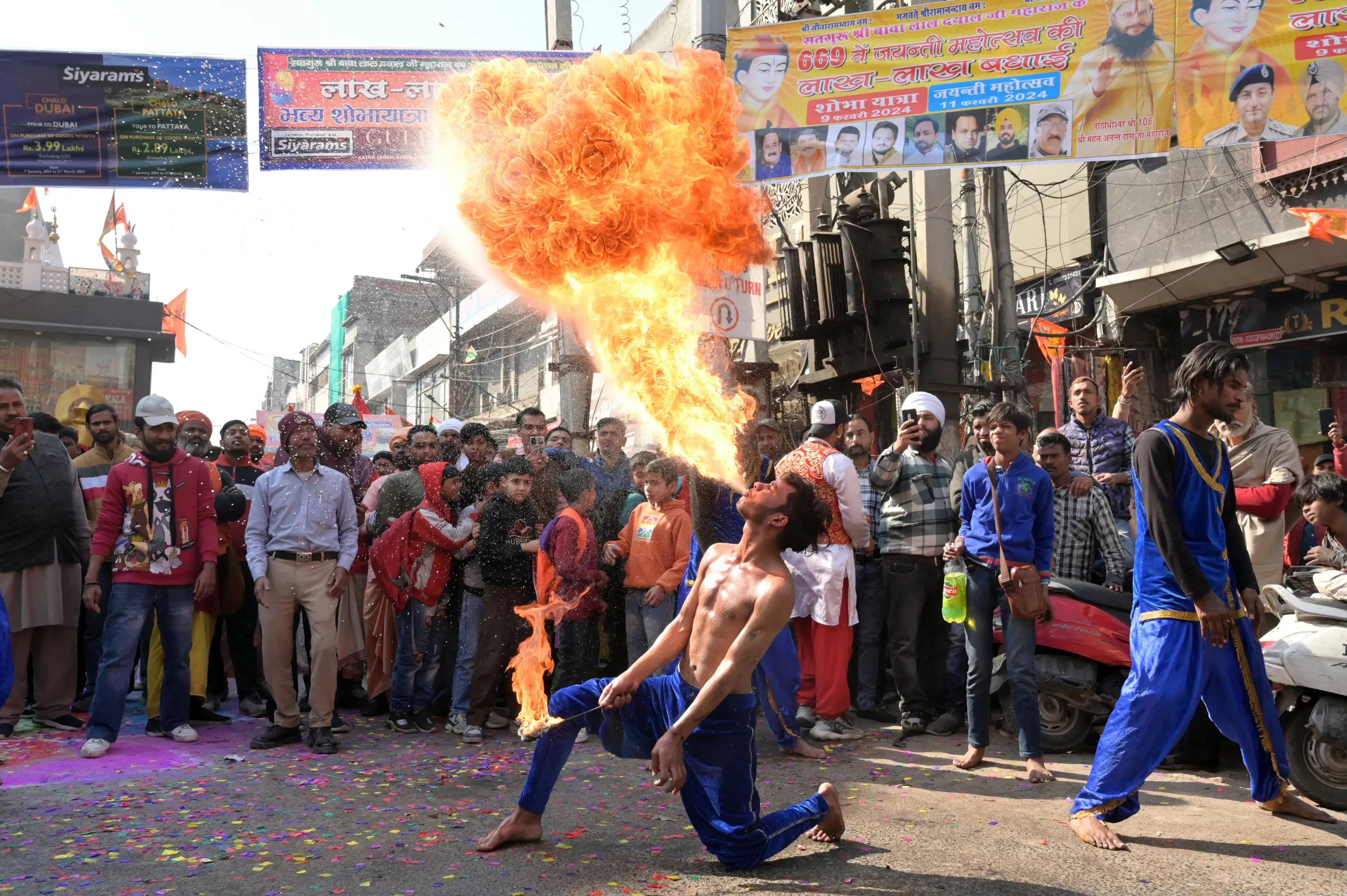 A dancer performs a fire breathing act during a procession to mark the 669th anniversary of the birth of Hindu Guru Bawa Lal Dayal in Amritsar on February 9,2024. (Photo by Narinder Nanu/AFP Photo)