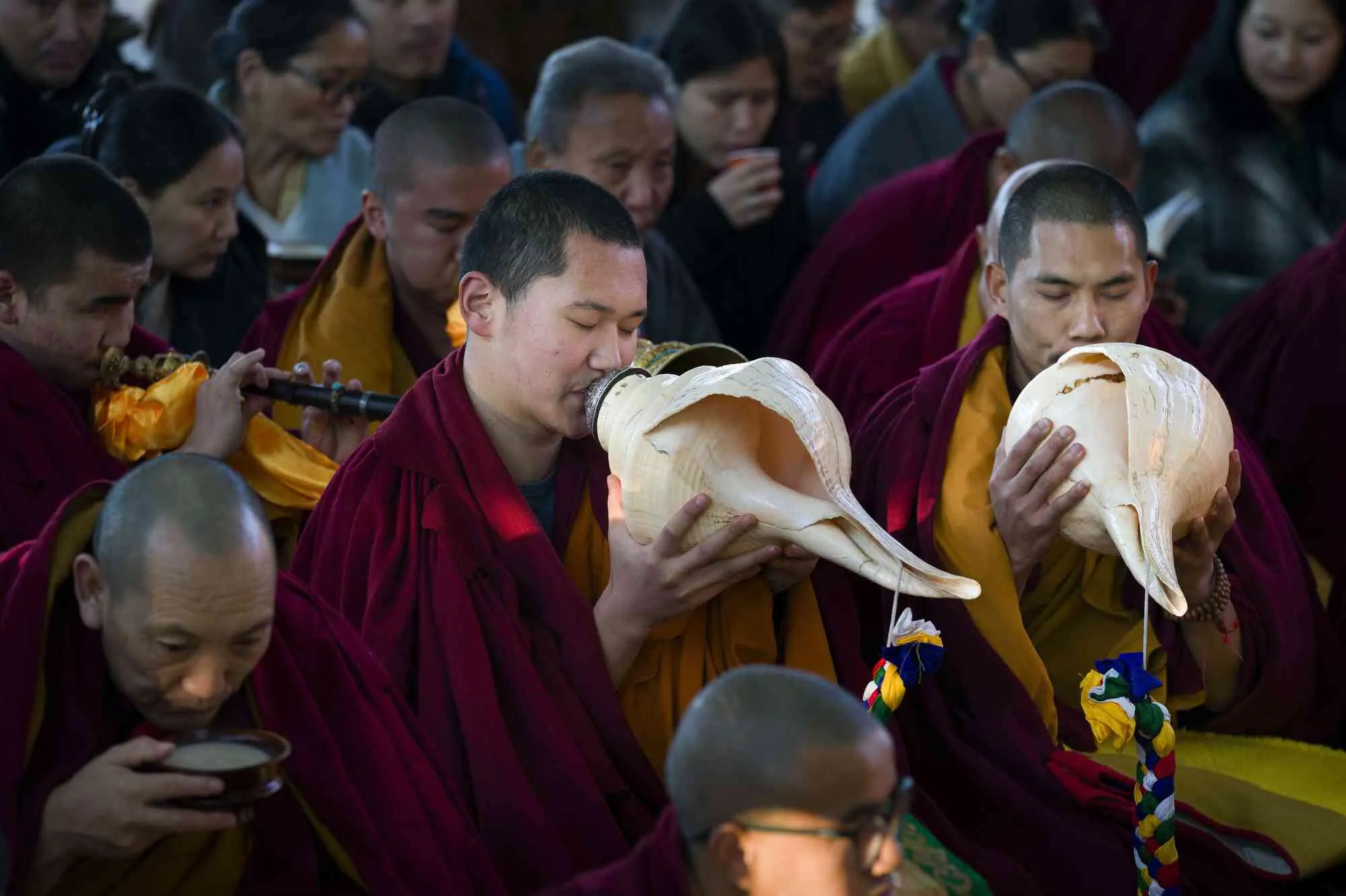 Exile Tibetan Buddhist monks blow ceremonial conch shells during an early morning prayer session to mark the first day of the Lunar New Year at the Tsuglakhang temple in Dharamshala, India, Saturday, February 10, 2024. (Photo by Ashwini Bhatia/AP Photo)