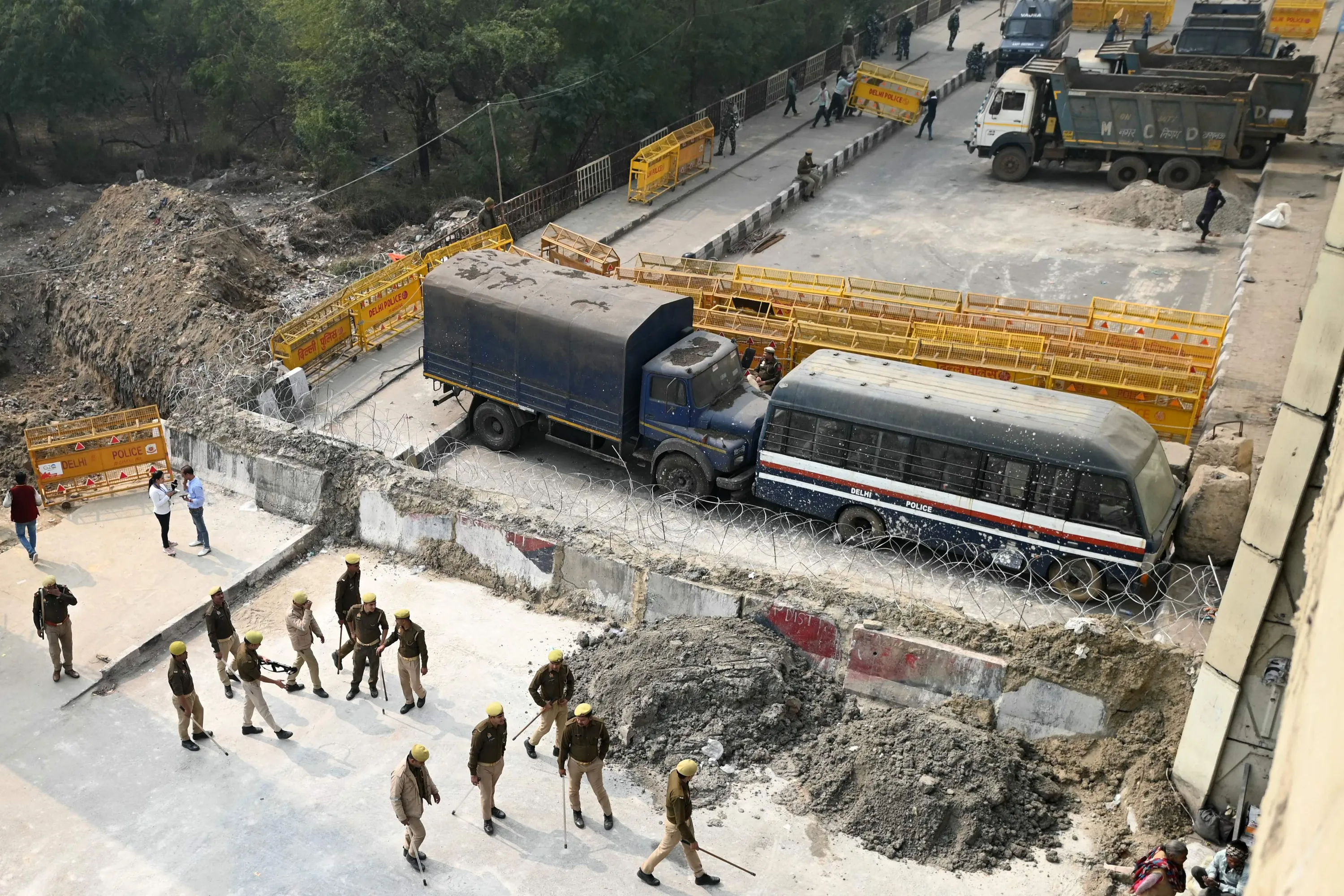 Police personnel stand guard next to a barrier and vehicles blocking a road to prevent farmers protesting to demand minimum crop prices from marching towards India's capital at the Delhi-Uttar Pradesh border in Ghazipur on February 14, 2024. (Photo by Sajjad Hussain/AFP Photo)
