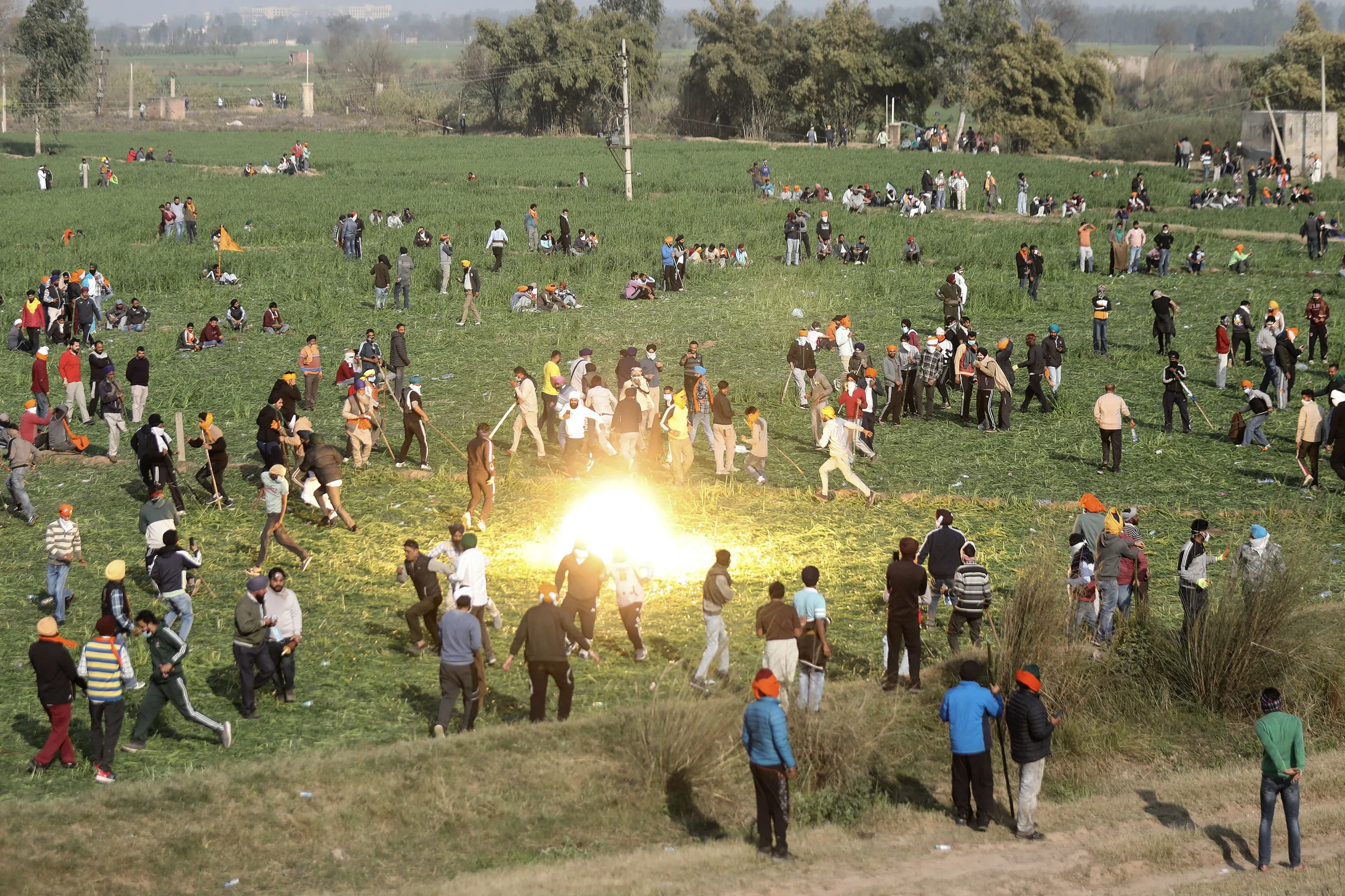 Protesting farmers clash with Indian Police on the second day of their protest, as it tries to prevent them from moving towards Delhi, at Shambhu Haryana-Punjab border point, 250 kilometers from Delhi, India, 14 February 2024. The farmers from several farmer associations mainly from Uttar Pradesh, Haryana and Punjab are headed in a march to Delhi from the Ambala-Shambhu, Khanauri-Jind border points, as part of a protest demanding a law guaranteeing minimum support price (MSP) for their produce. (Photo by Rajat Gupta/EPA)