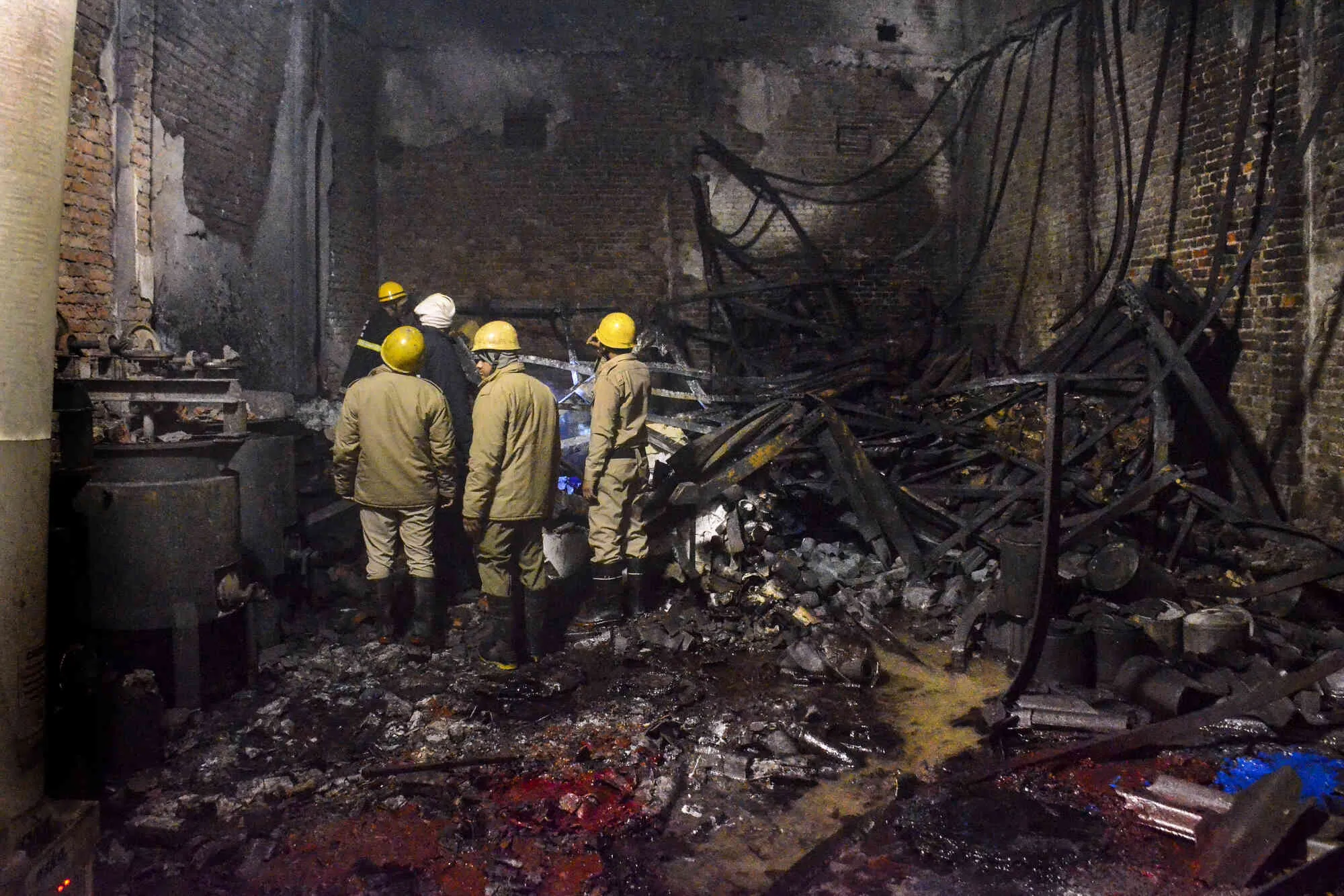 Fire brigade personnel look on after dousing a late Thursday fire at a paint factory in the Alipur area in northern New Delhi, India, Friday, February 16, 2024. Charred bodies of 11 unidentified victims were recovered from the rubble. The cause of the fire was not immediately clear. (Photo by AP Photo)