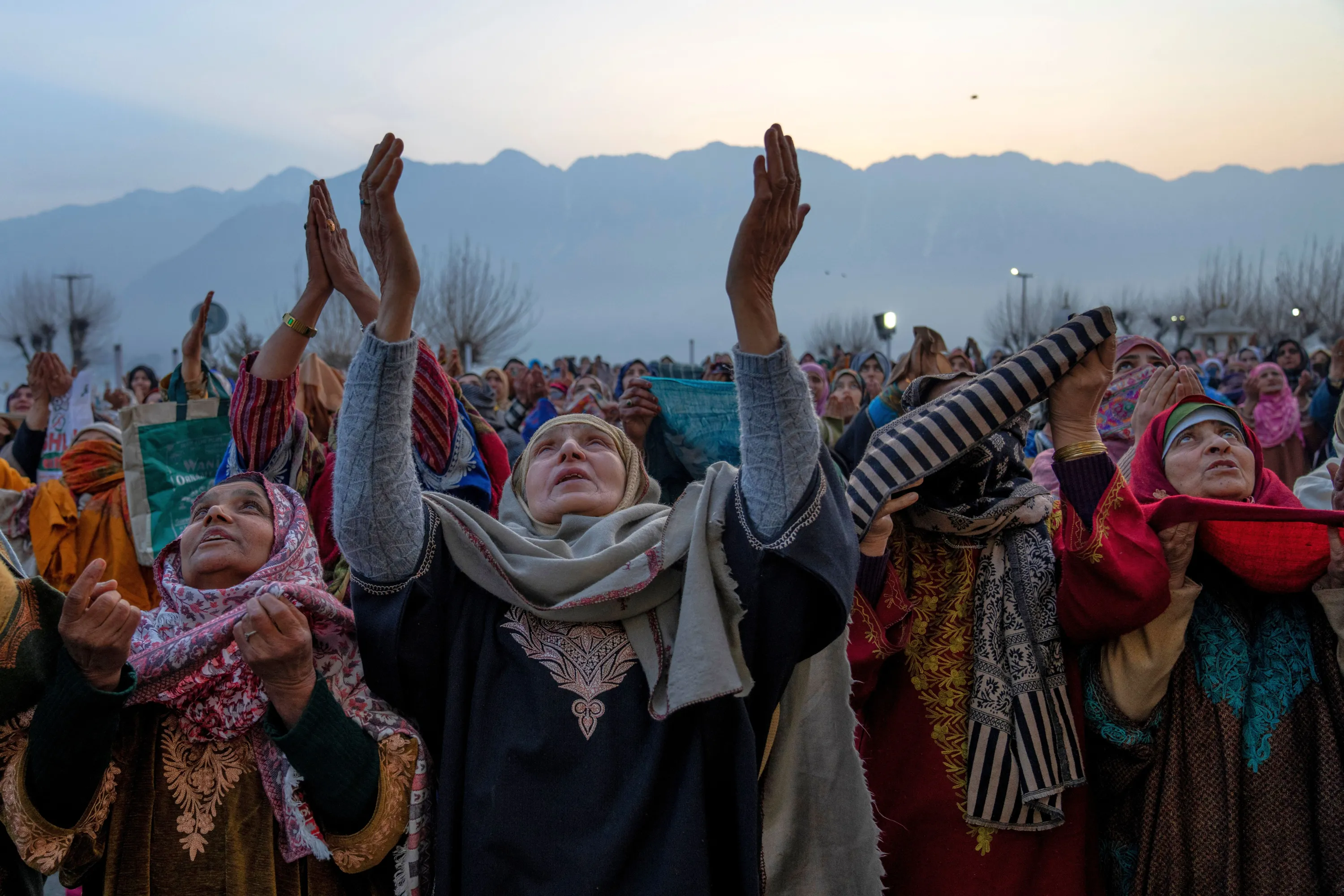 Kashmiri Muslims raise their hands for prayers outside the Hazratbal Shrine in Srinagar, Indian controlled Kashmir, Friday, February 16, 2024, as the head priest, unseen, displays a holy relic believed to be a hair from the beard of Prophet Mohammad, following the Islamic festival of Shab-e-Meraj that took place at the shrine last Thursday. Shab-e-Meraj, the anniversary of Prophet Mohammad's ascent to heaven, was marked on February 8. (Photo by Dar Yasin/AP Photo)