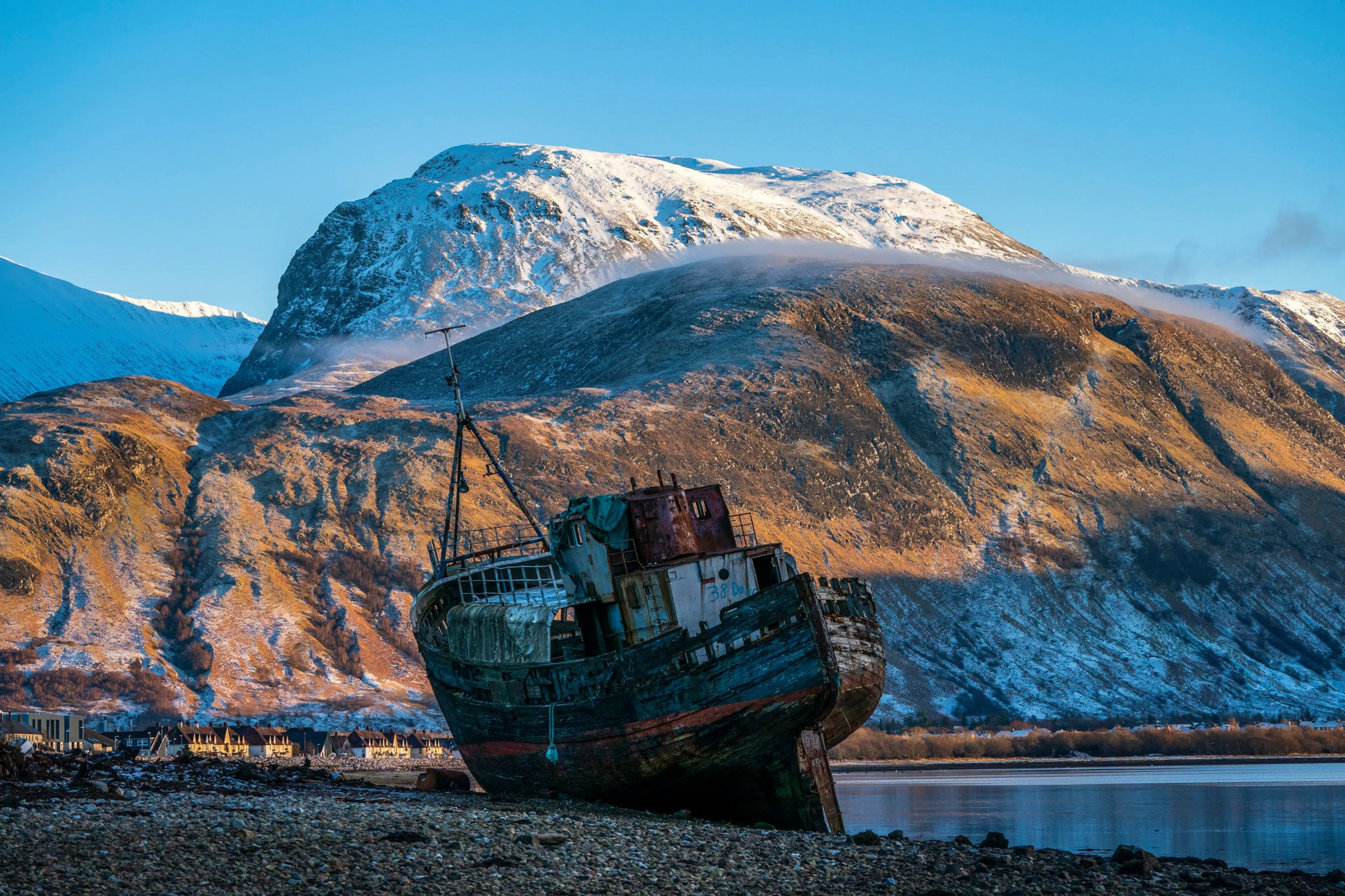 Ben Nevis looms over the wreck of the Golden Harvest fishing boat on the banks of Loch Linnhe near Fort William in the western Scottish Highlands on Thursday, January 11, 2024. (Photo by Jane Barlow/PA Images via Getty Images)
