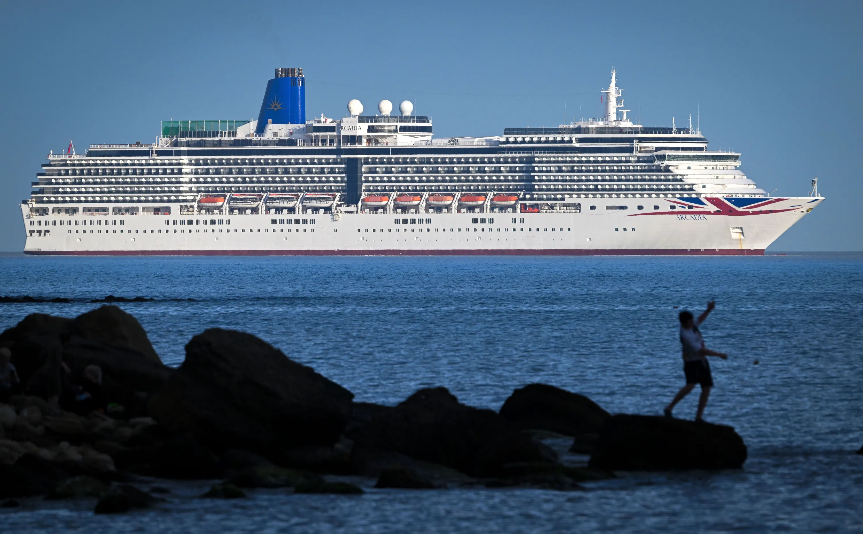 The P&O cruise ship Arcadia is seen moored in Weymouth Bay, on April 13, 2022 in Weymouth, United Kingdom. P&O have stated that a number of cruises were cancelled due to a staff shortage and the cruise ship was unable to operate commercial cruises due to difficulties recruiting staff members and existing staff have been moved to other P&O ships. Arcadia is in Weymouth Bay following the impact on the wider hospitality industry caused by Covid-19 which has resulted in disruption to crew members available to join the ships. (Photo by Finnbarr Webster/Getty Images)