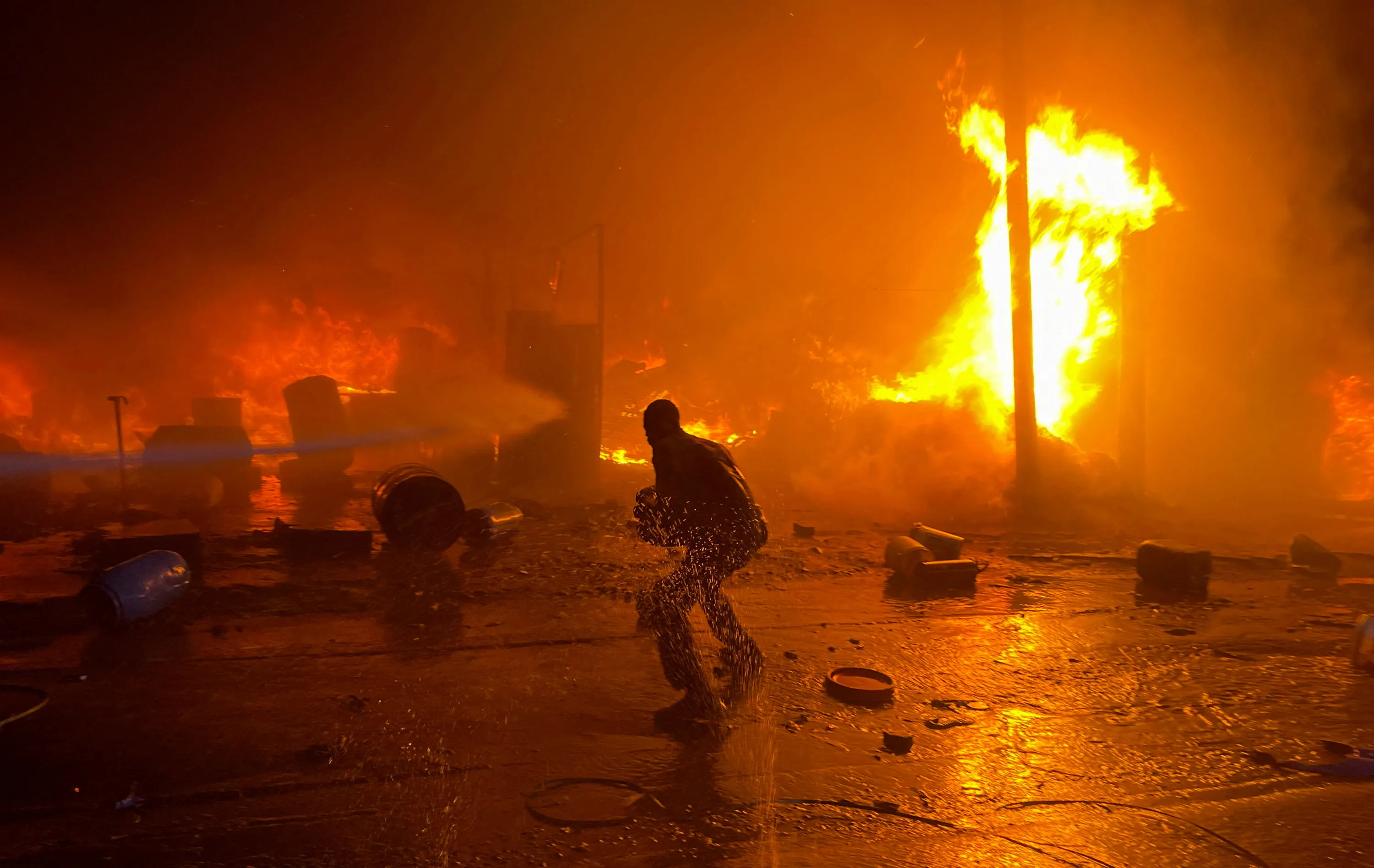 A trader bends as firefighters attempt to extinguish a fire that broke out at a commercial depot, used for oil barrels and flammable drums, near Muthurwa settlement, in Nairobi, Kenya on January 30, 2024. (Photo by Thomas Mukoya/Reuters)