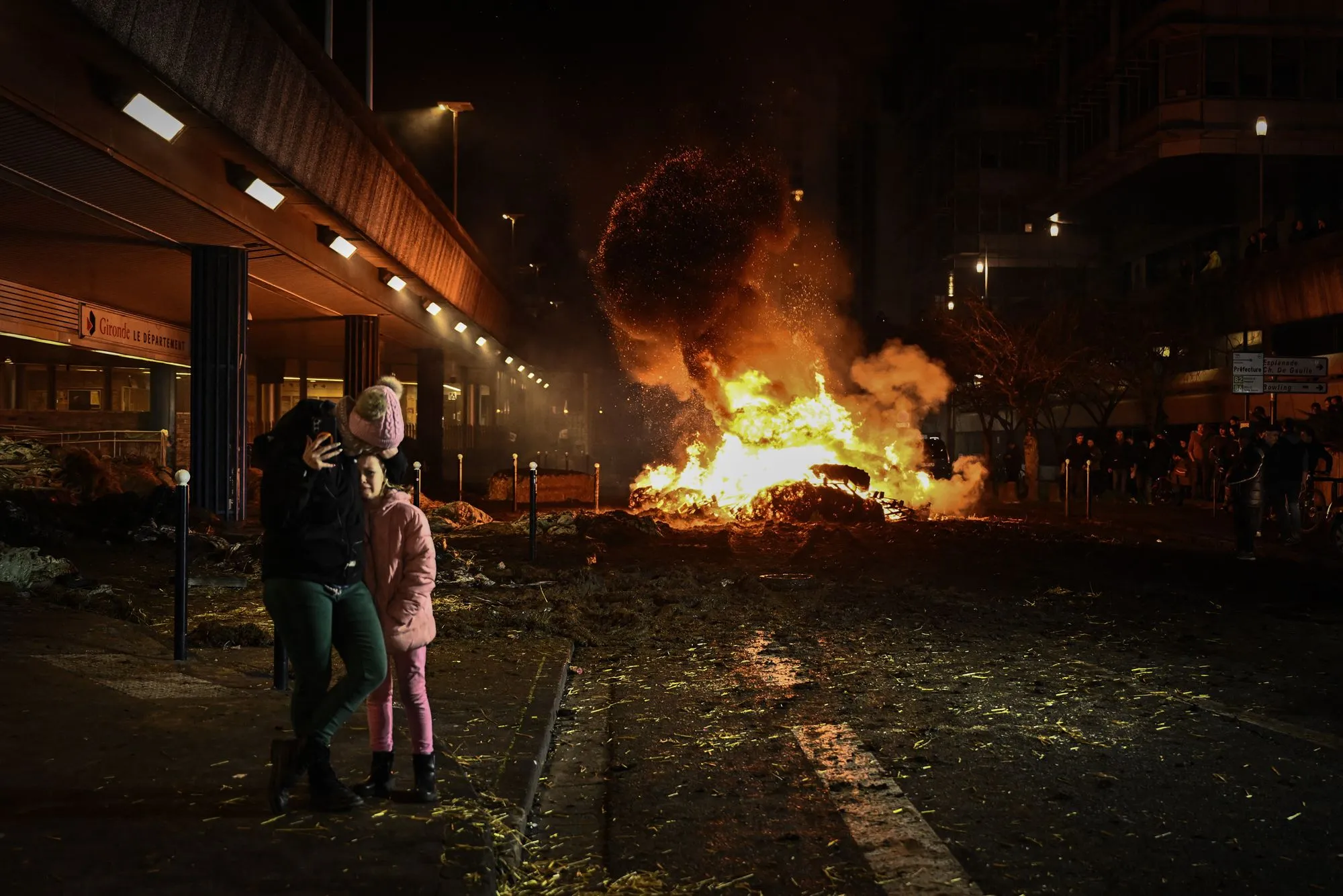 A farmer and her child stand near burning hay-bales during farmers' protest in front of the Gironde prefecture in Bordeaux, southwestern France, on January 25, 2024. France's powerful farming unions have demanded concrete government action to address their grievances, which they say include excessive financial charges and environmental protection rules as well as insufficient prices for their produce. (Photo by Philippe Lopez/AFP Photo)