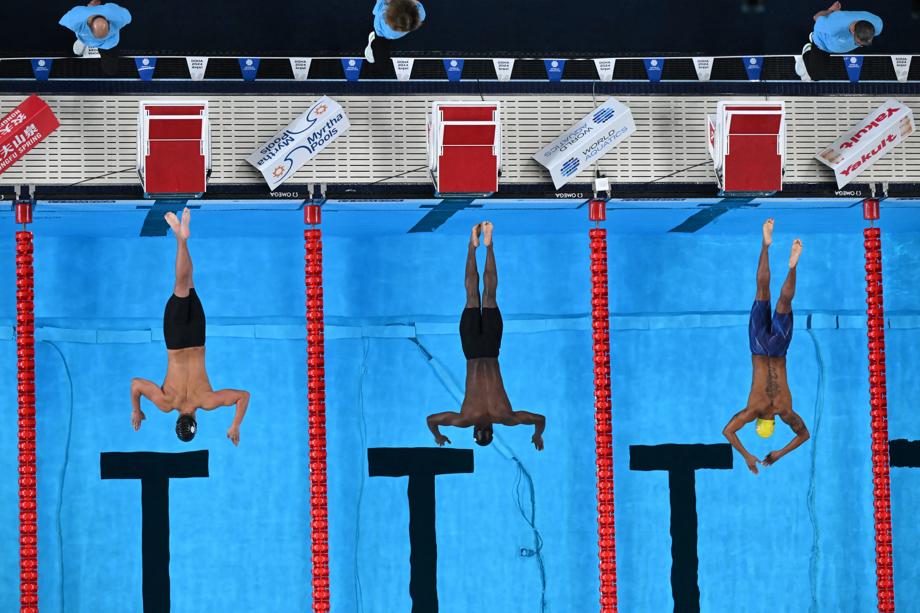 Swimmers compete in a heat of the men's 100m butterfly swimming event during the 2024 World Aquatics Championships at Aspire Dome in Doha on February 16, 2024. (Photo by Oli Scarff/AFP Photo)