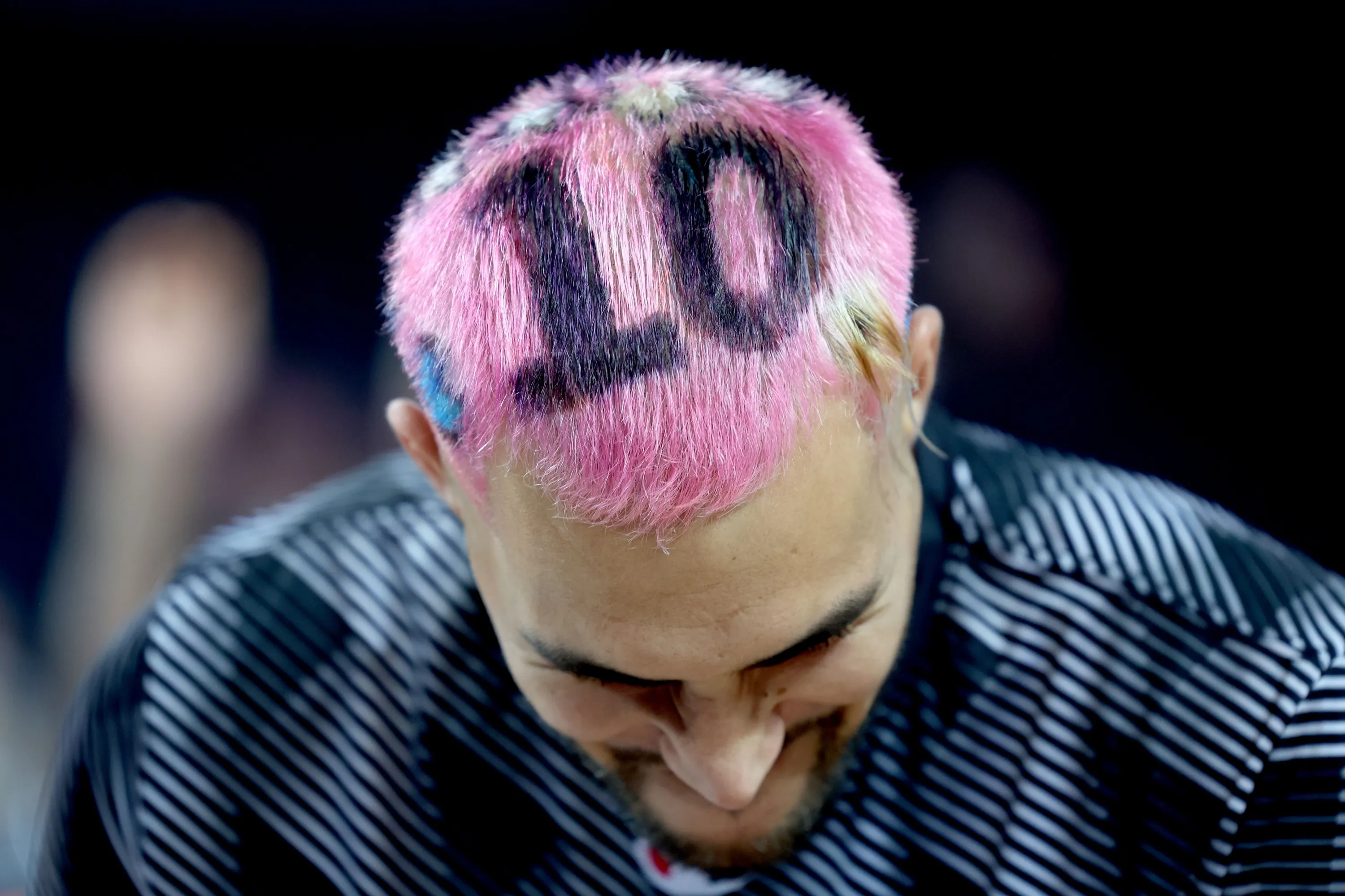 Dom Kelman-Potu of the New Zealand Breakers with the jersey number 10 for Tom Abercrombie painted in his hair during the round 20 NBL match between New Zealand Breakers and Brisbane Bullets at Spark Arena, on February 16, 2024, in Auckland, New Zealand. (Photo by Phil Walter/Getty Images)