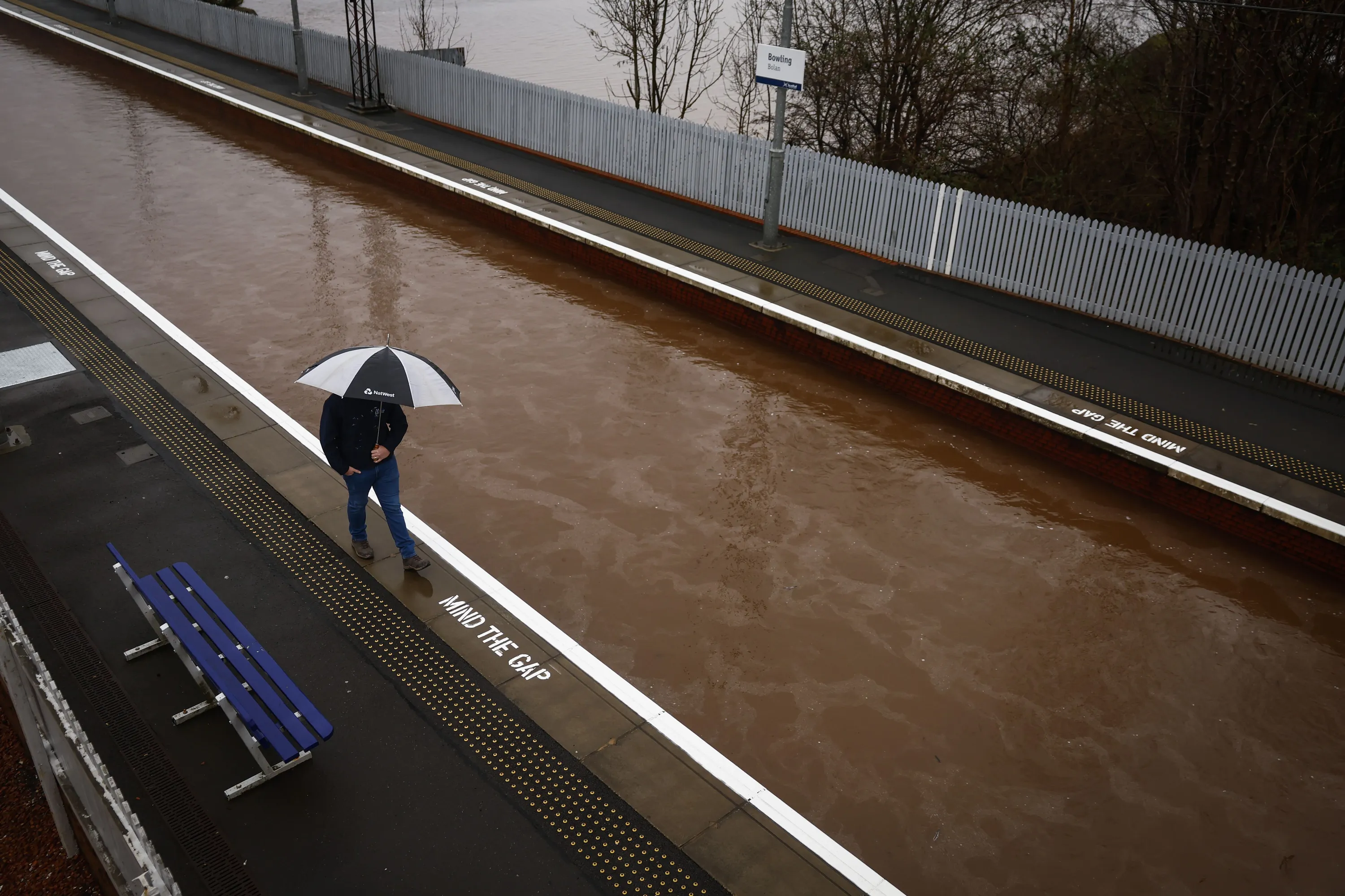 A member of the public is seen on the platform of Bowling station which is shut by flooding on December 27, 2023 in Bowling, Scotland. The Met Office issued yellow wind warnings, with gusts up to 70mph for exposed coastal regions in England, Wales, and Northern Ireland, alongside wintry weather across much of Scotland, marking the seventh named storm in the current UK storm season, spanning September to August next year. (Photo by Jeff J. Mitchell/Getty Images)