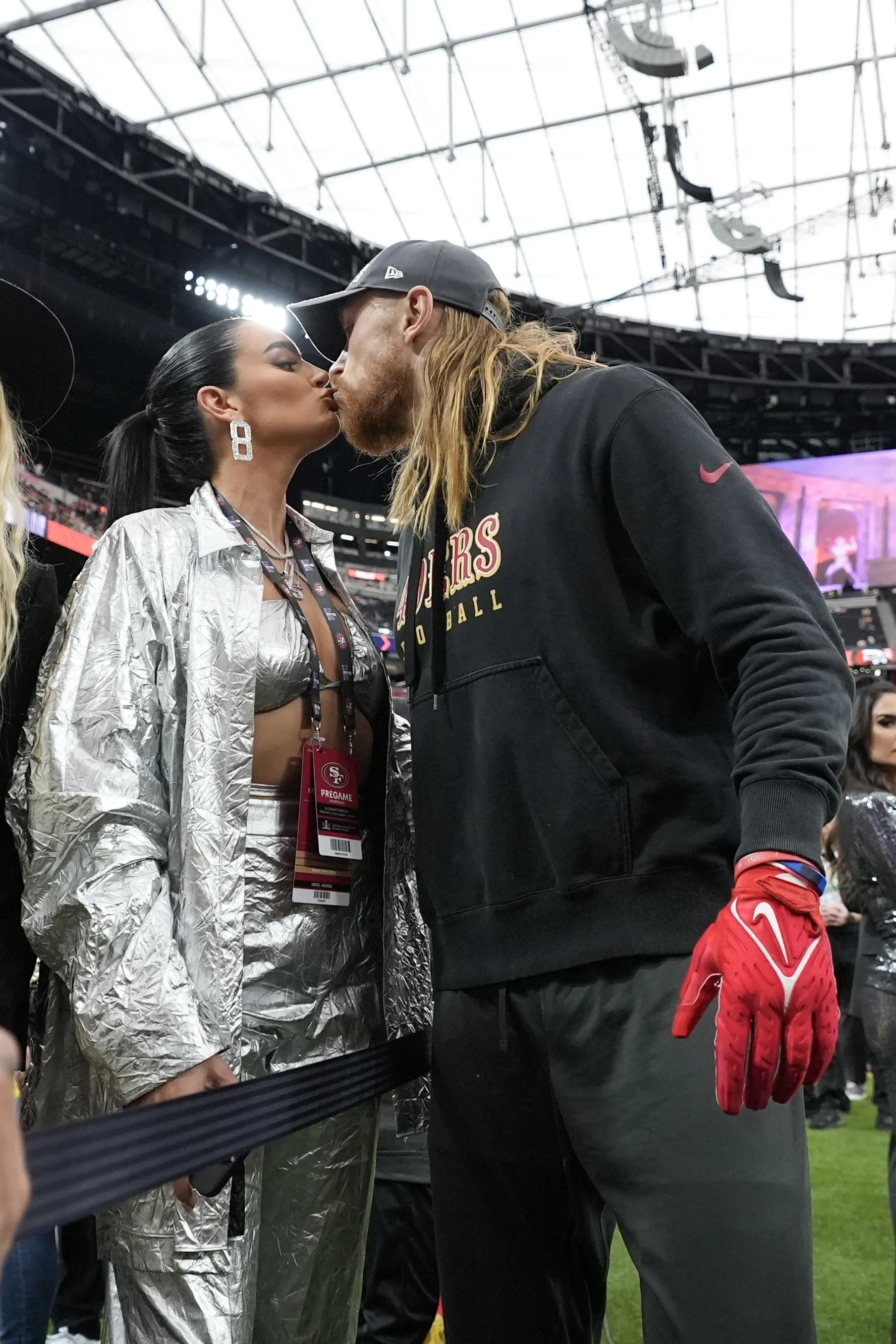 San Francisco 49ers tight end George Kittle, right, kisses his wife Claire Kittle before the NFL Super Bowl 58 football game against the Kansas City Chiefs, Sunday, February 11, 2024, in Las Vegas. (Photo by Ashley Landis/AP Photo)