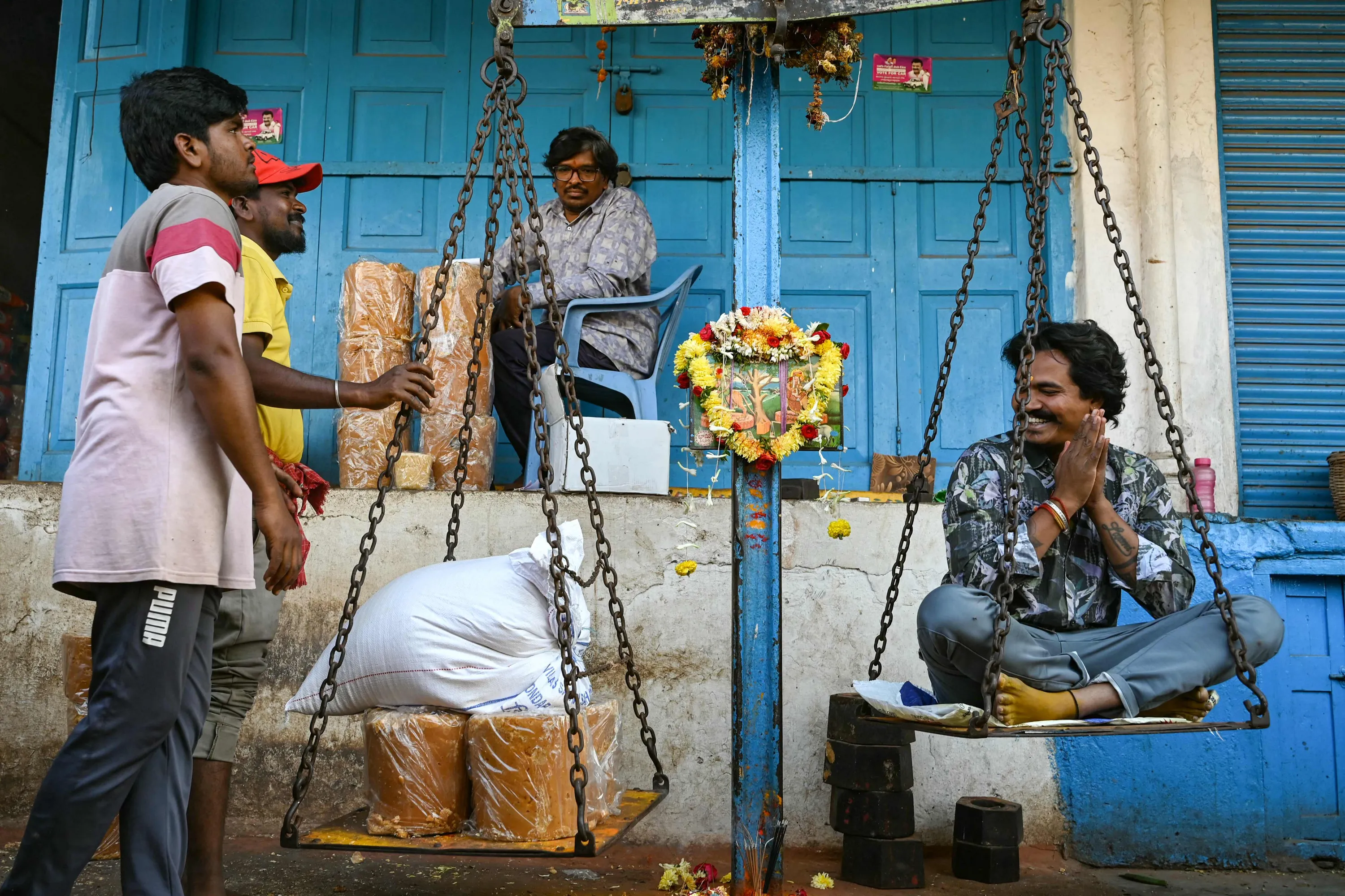 A Hindu devotee (R) sits on a weighing scale to buy jaggery in a quantity equal to his weight to worship tribal deities ahead of the Medaram Jatara festival, at a wholesale shop in Hyderabad on February 18, 2024. (Photo by Noah Seelam/AFP Photo)