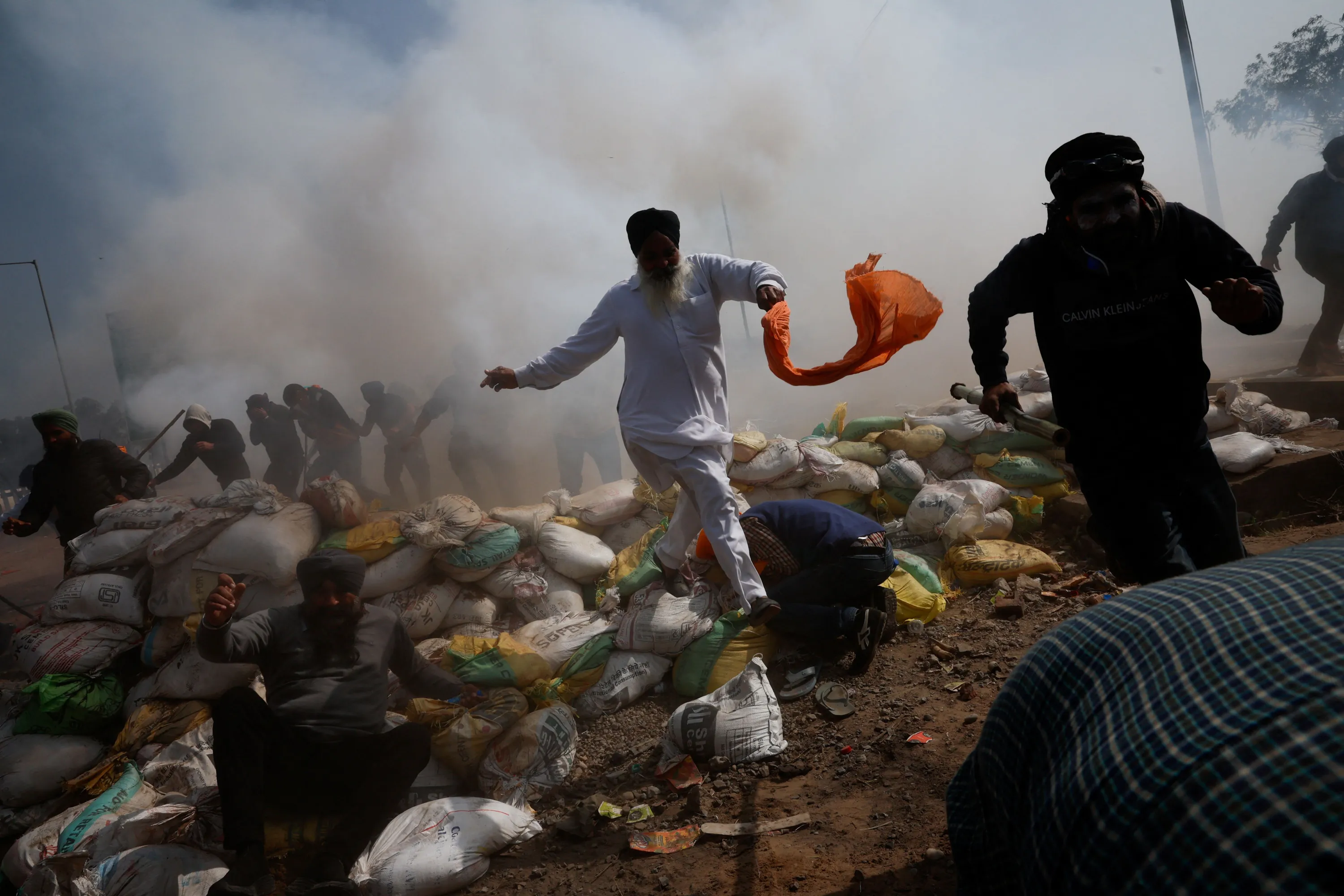 Farmers, who are marching towards New Delhi to press for better crop prices promised to them in 2021, run for cover amidst tear gas fired by police to disperse them at Shambhu barrier, a border crossing between Punjab and Haryana states, India, on February 21, 2024. (Photo by Adnan Abidi/Reuters)