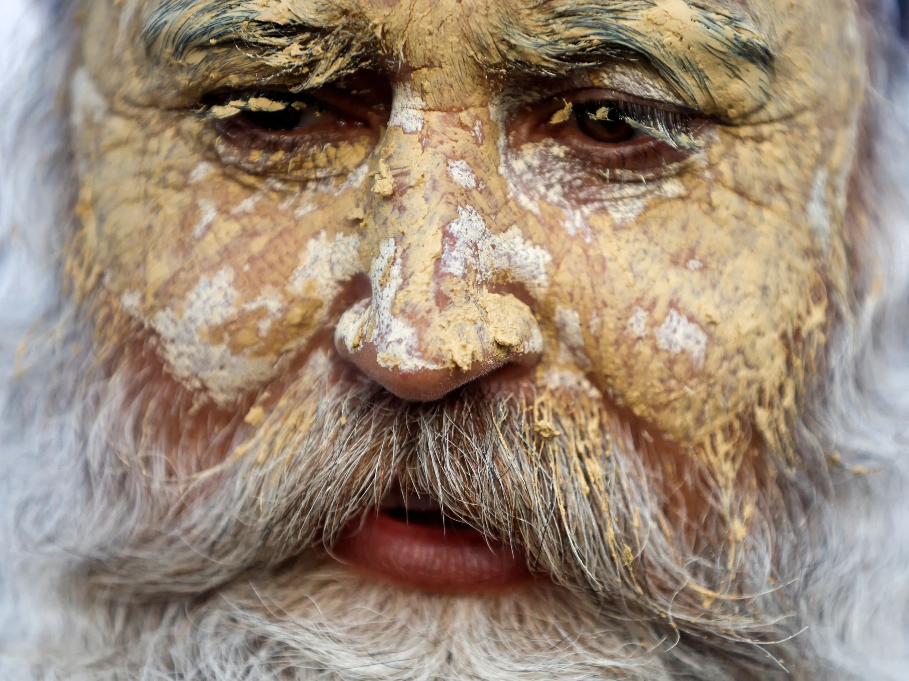 A farmer wears a traditional face pack, to protect himself from tear gas, at the site of the protest, as farmers march towards New Delhi to press for better crop prices promised to them in 2021, at Shambhu barrier, a border crossing between Punjab and Haryana states, India on February 21, 2024. (Photo by Francis Mascarenhas/Reuters)