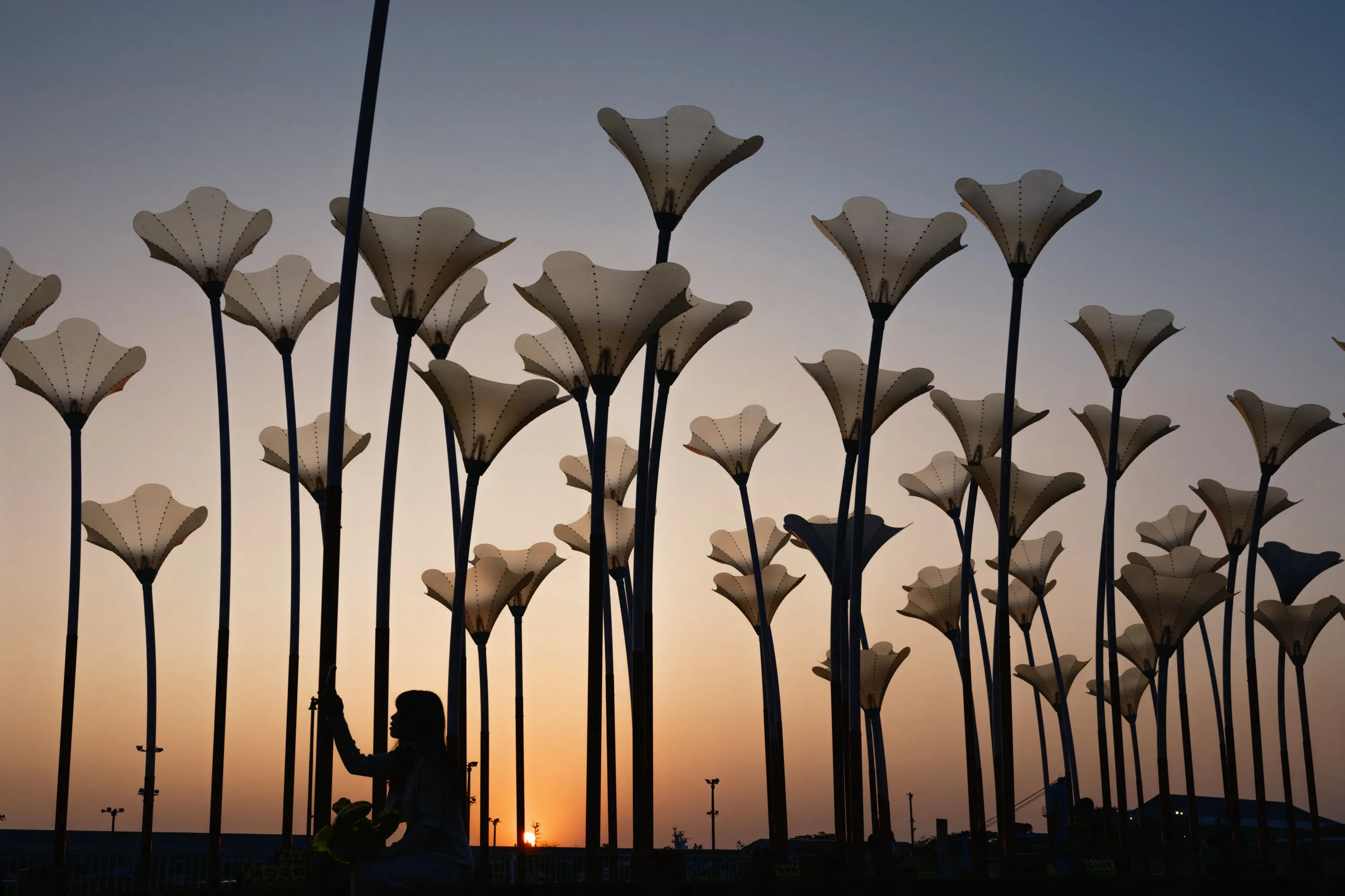 A woman prepares to take selfies for her 23rd birthday at sunset at the Pier-2 Art Center in Kaohsiung on January 10, 2024. (Photo by Yasuyoshi Chiba/AFP Photo)