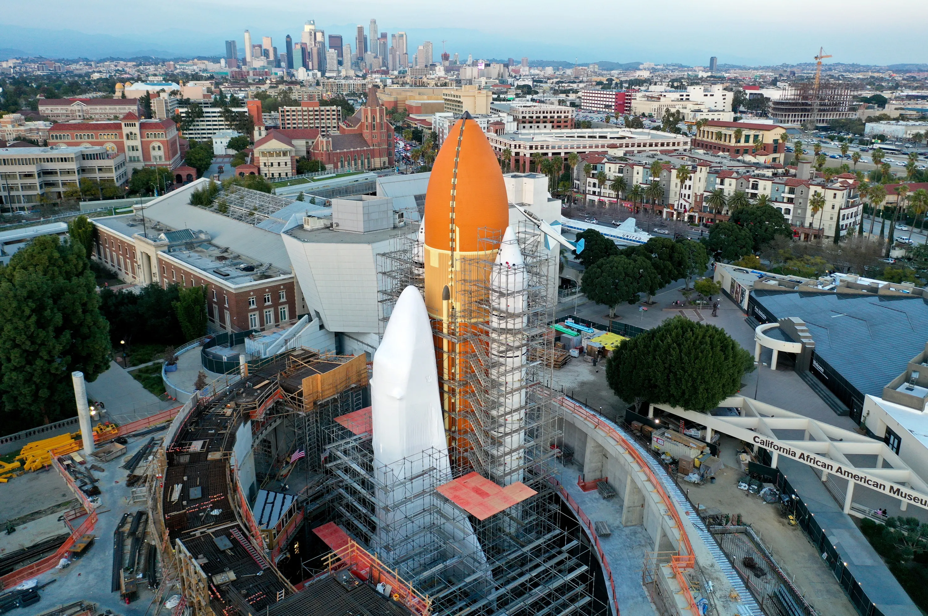 In an aerial view, construction continues around the retired NASA Space Shuttle Endeavour, covered in protective white wrapping, standing mated to the giant orange external tank and twin solid rocket boosters at the California Science Center on February 14, 2024 in Los Angeles, California. The Space Shuttle Endeavour will eventually be enclosed in a 20-story tall museum space in vertical launchpad position for display at the museum's future Samuel Oschin Air and Space Center. (Photo by Mario Tama/Getty Images)