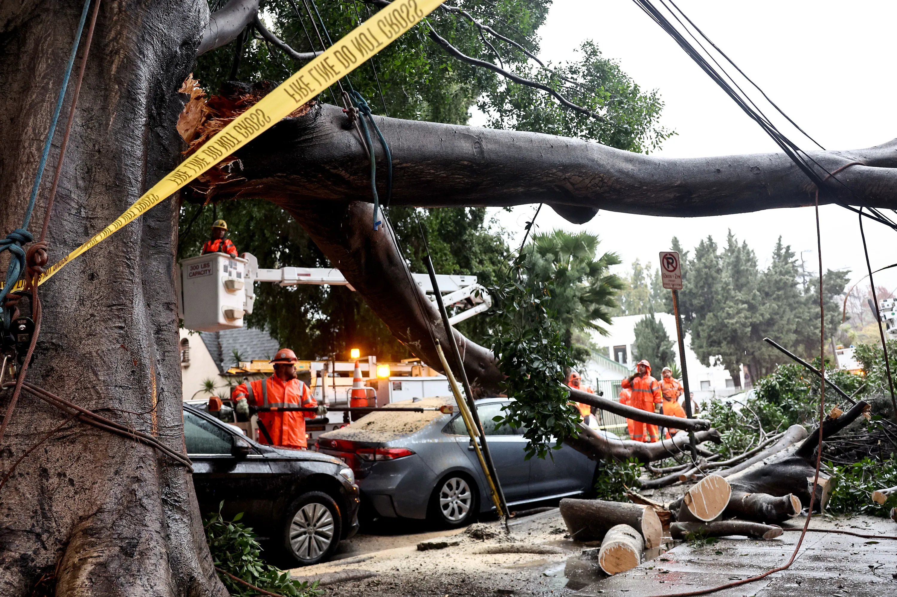 Workers clean up a residential street where a large tree branch fell knocking out power and damaging vehicles on February 19, 2024 in Los Angeles, California. Another atmospheric river storm is delivering heavy rains to California two weeks after a powerful storm brought widespread flooding, mudslides and power outages to parts of the state. (Photo by Mario Tama/Getty Images)