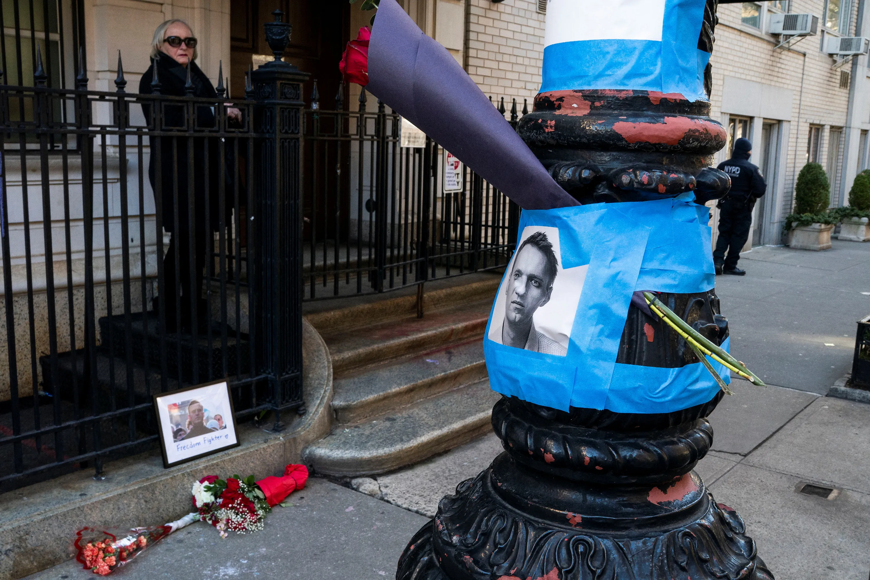 Images and flowers for the opposition leader Alexei Navalny are placed outside of the Russian consulate in New York City, U.S., February 19, 2024. (Photo by Eduardo Munoz/Reuters)
