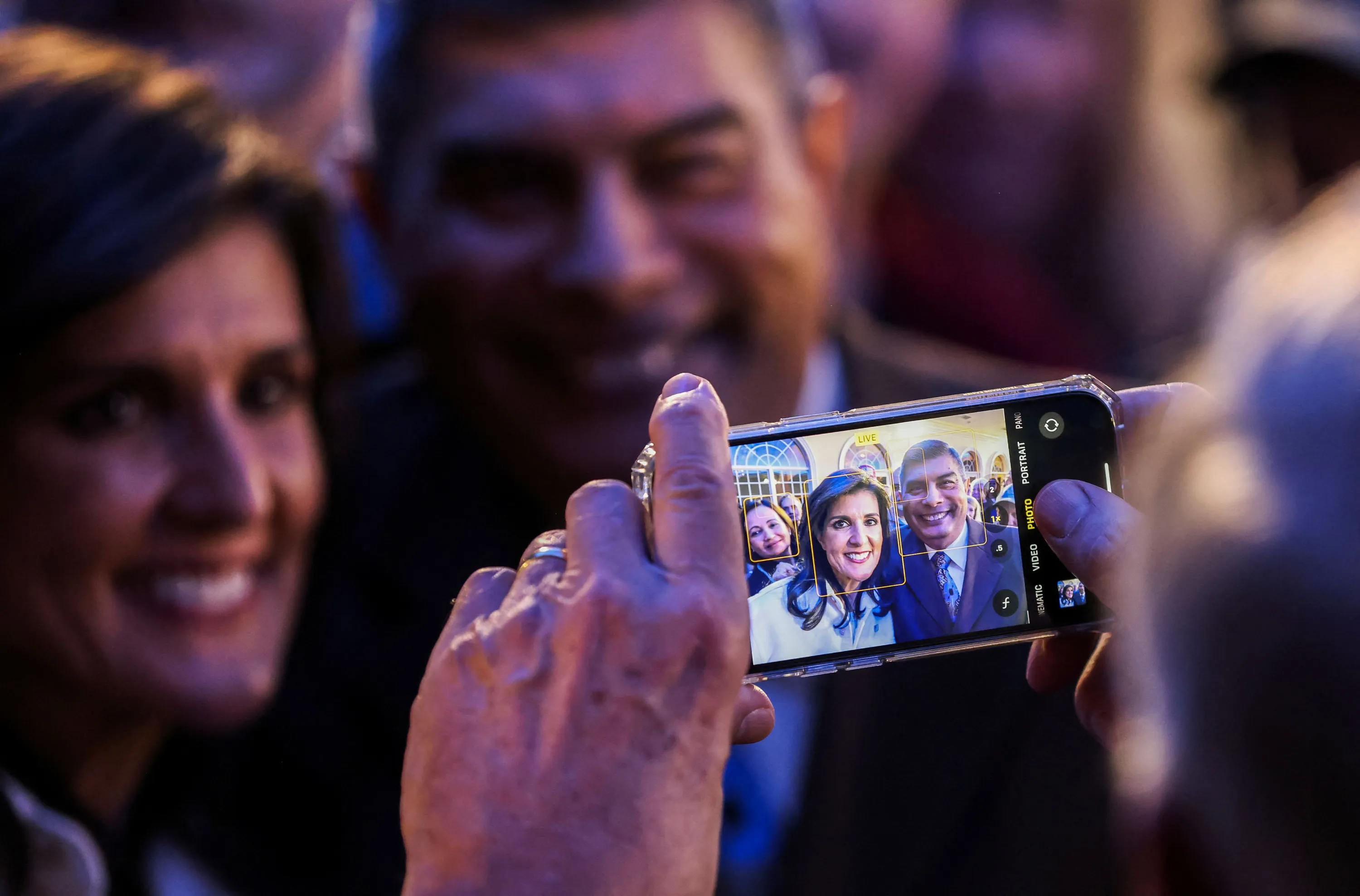 Republican presidential candidate and former U.S. Ambassador to the United Nations Nikki Haley is photographed with a supporter during a campaign event in Rock Hill, South Carolina, U.S., February 18, 2024. (Photo by Sam Wolfe/Reuters)