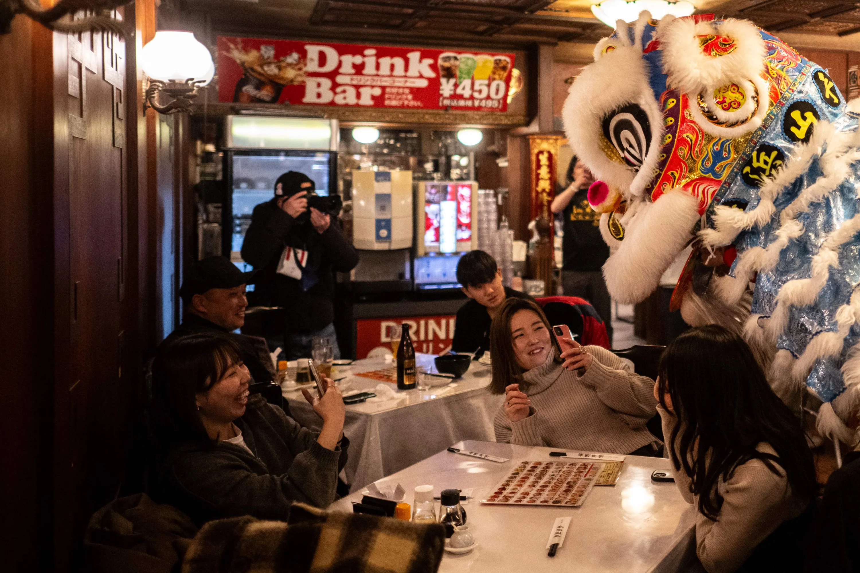 Diners watch a lion dance in a restaurant of the Chinatown area of Yokohama on February 10, 2024, on the first day of the Lunar New Year of the Dragon. (Photo by Philip Fong/AFP Photo)