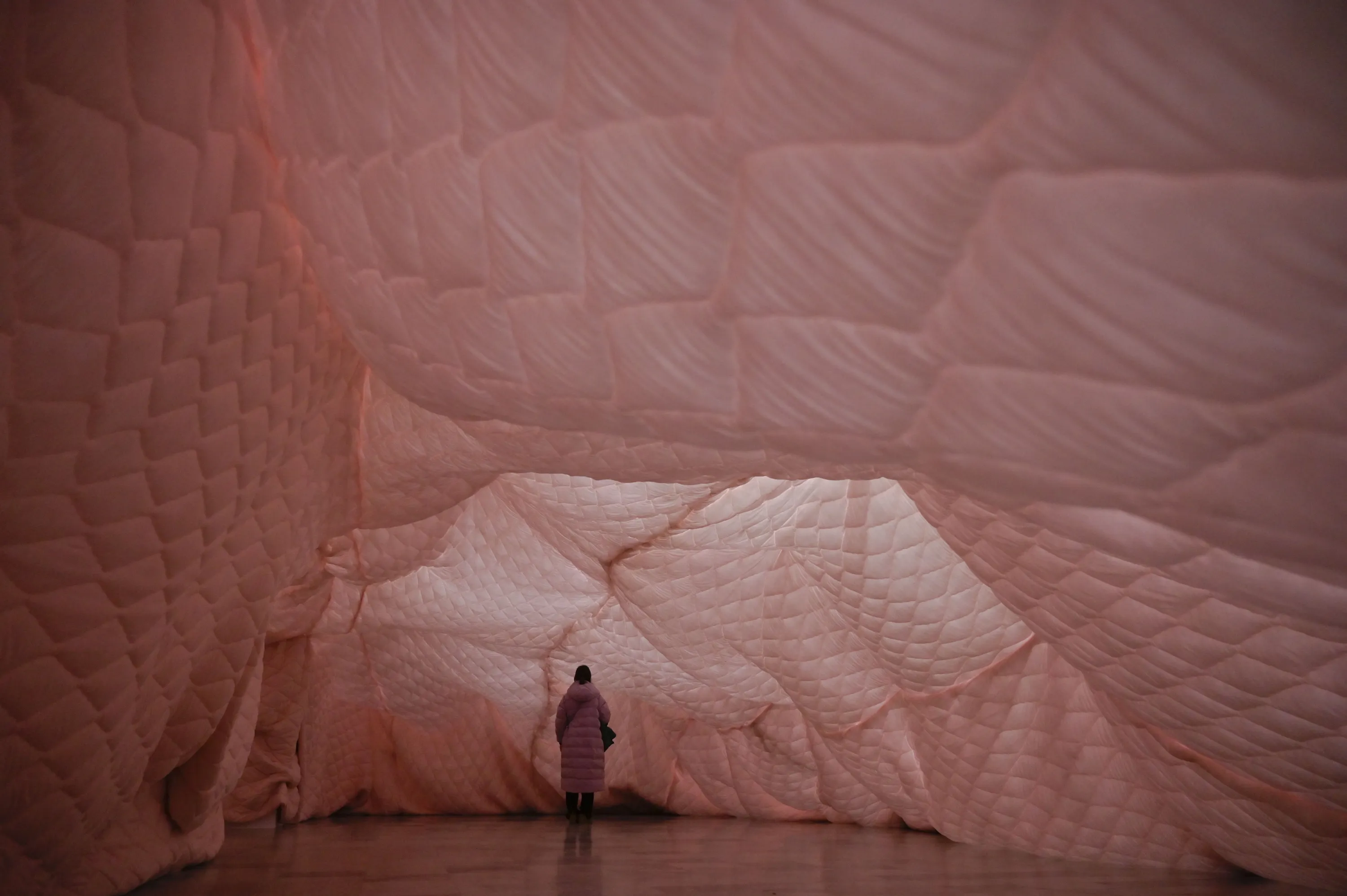 A visitor walks through the national gallery of Kosovo covered in oversized pre-made duvet as part of art exhibition by Haveit Collective entitled “Day Into Night, Night Into Year”, in Pristina on January 23, 2024. (Photo by Armend Nimani/AFP Photo)