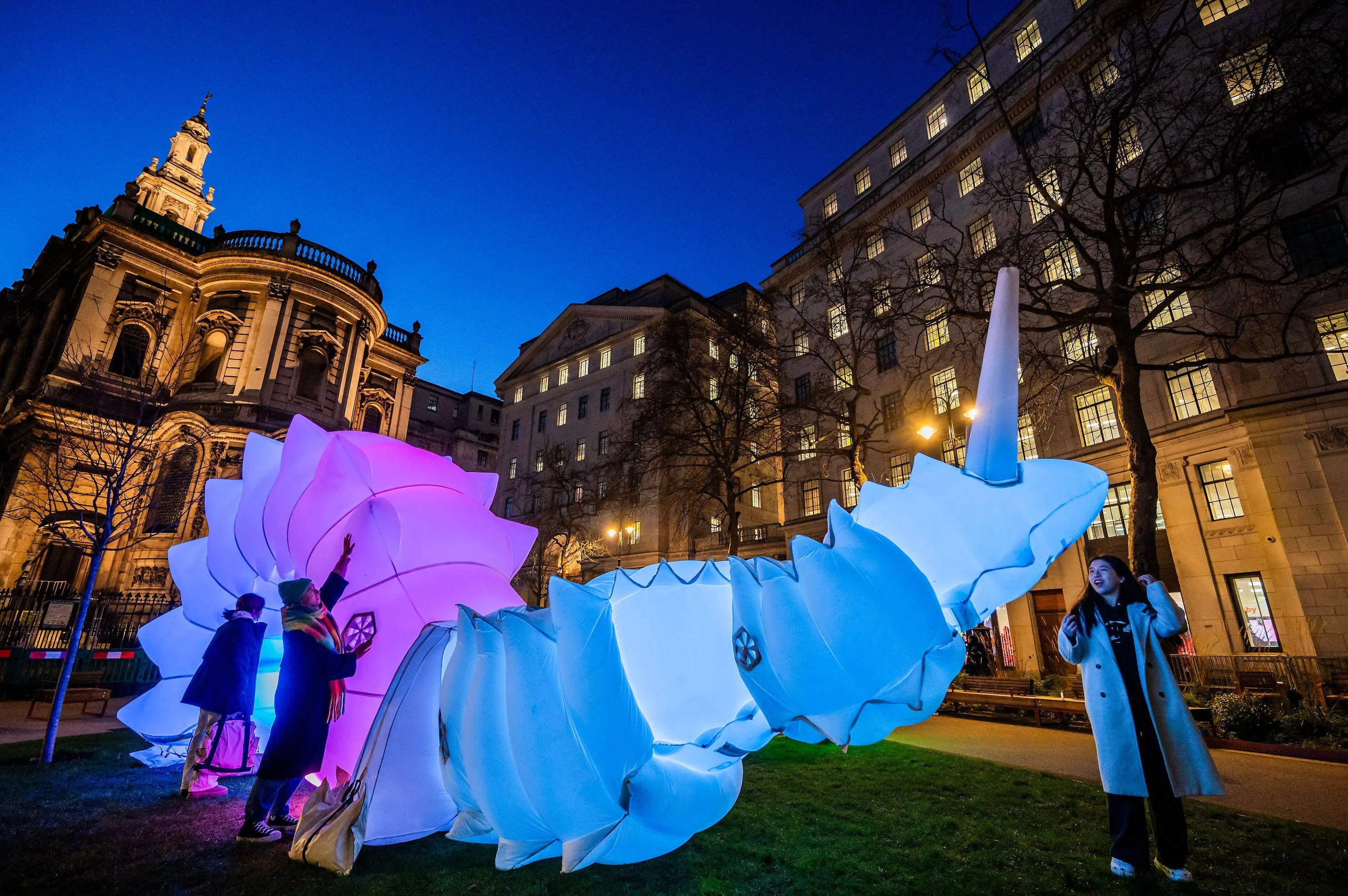 King's College London on January 16, 2024 presents Air Giants: The Glowbot Garden, an installation of giant soft robots, which respond to touch. They will be displayed along the Strand, Aldwych, from 17–20 January 2024. (Photo by Guy Bell/Alamy Live News)