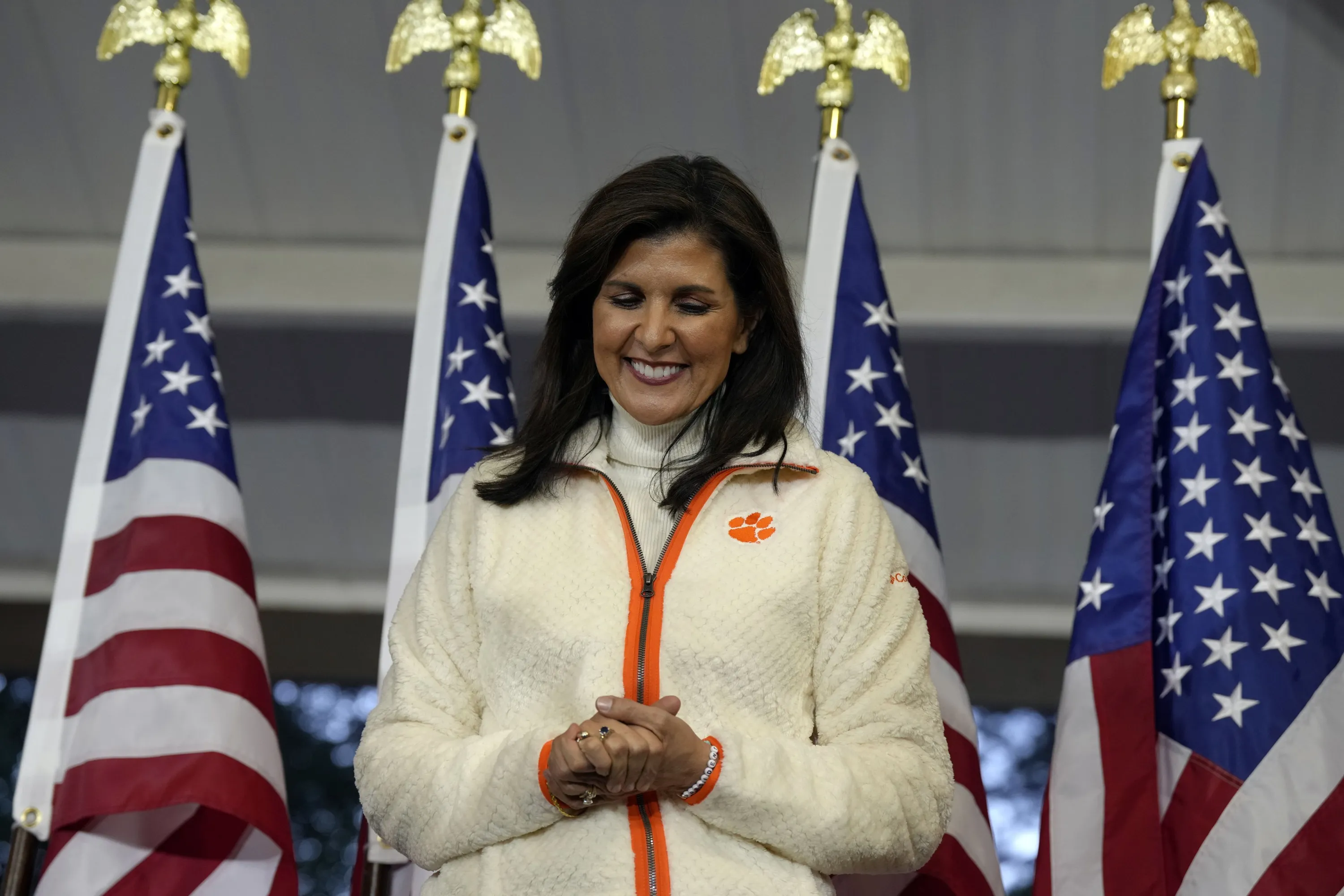 Republican presidential candidate former UN Ambassador Nikki Haley smiles as she's introduced at a campaign rally on Tuesday, February 20, 2024, in Clemson, S.C. (Photo by Meg Kinnard/AP Photo)