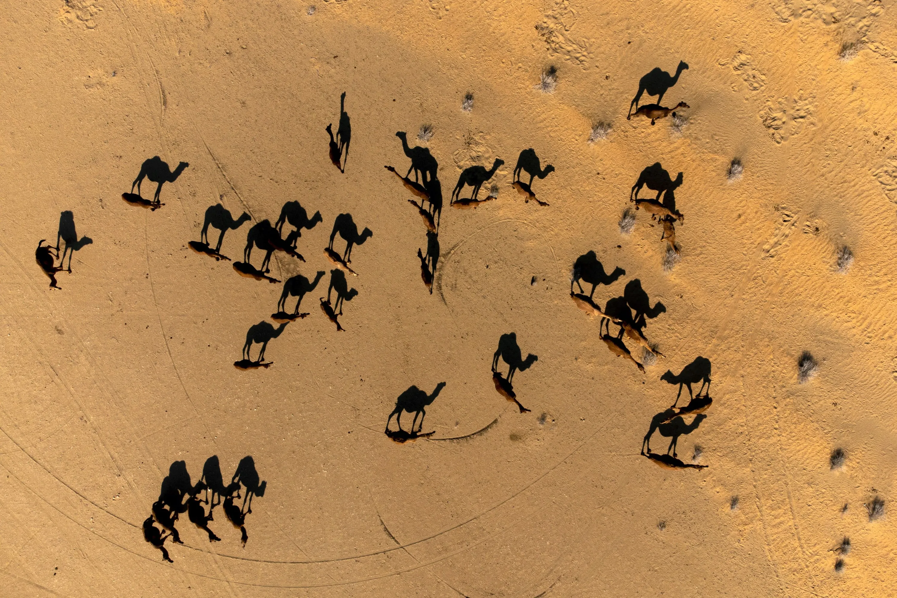 This aerial photograph taken on January 27, 2024 shows a herd of camels in the desert of Samawa in Iraq's southern province of al-Muthanna. (Photo by Hussein Faleh/AFP Photo)