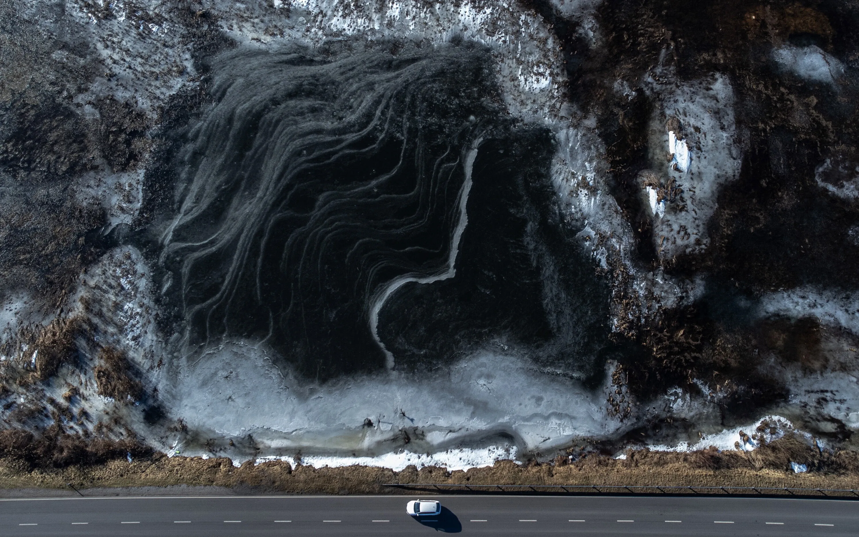 An aerial photo made with a drone shows ice floe drifting on the Wieprz river in Jeziorzany village, eastern Poland, 30 January 2024. Water levels at waterways rose to near critical levels as temperatures in Jeziorzany were reported at minus 2 degrees Celsius. (Photo by Wojtek Jargilo/EPA)