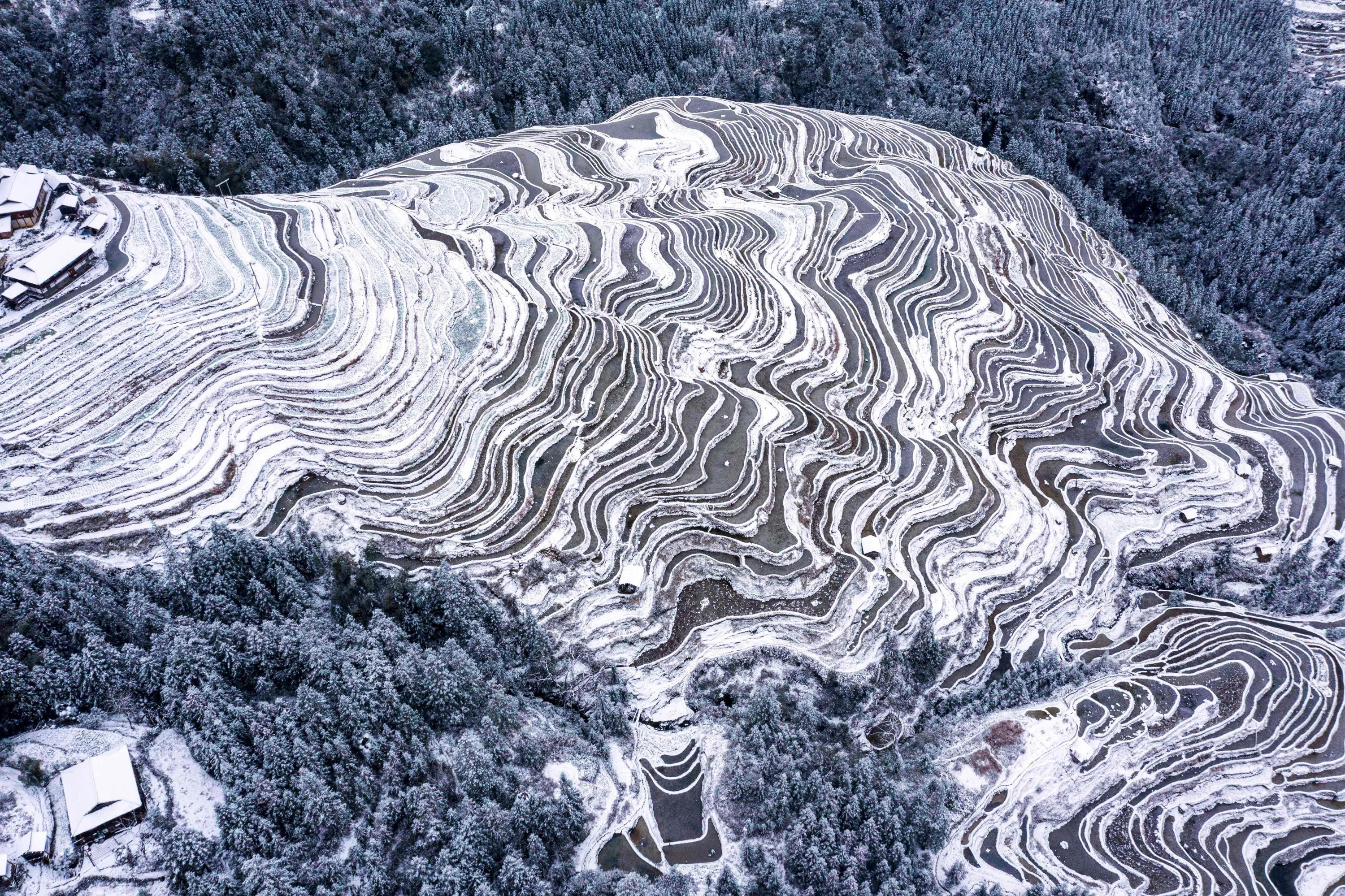 The aerial view shows snow-covered terraced fields and houses in Congjiang county, in China's southwestern Guizhou province on January 22, 2024. (Photo by AFP Photo/China Stringer Network)