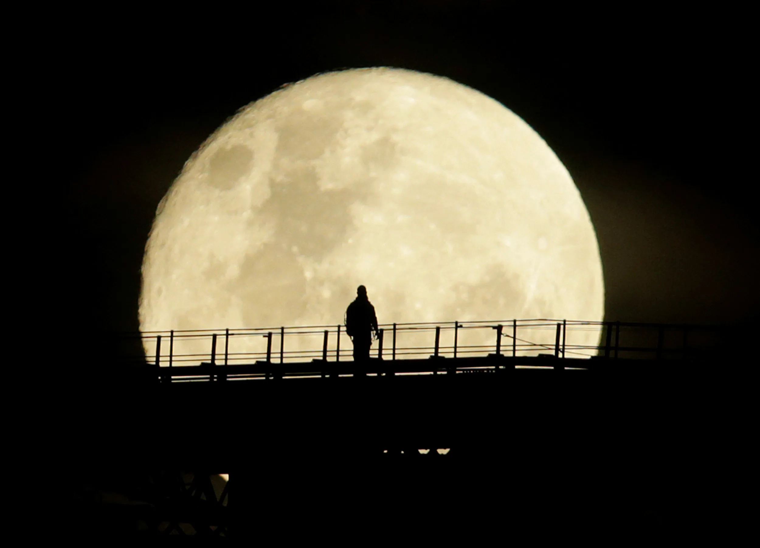 A man walks on the top span of the Sydney Harbour Bridge as the supermoon enters its final phase in Sydney, Australia, November 15, 2016. (Photo by Jason Reed/Reuters)