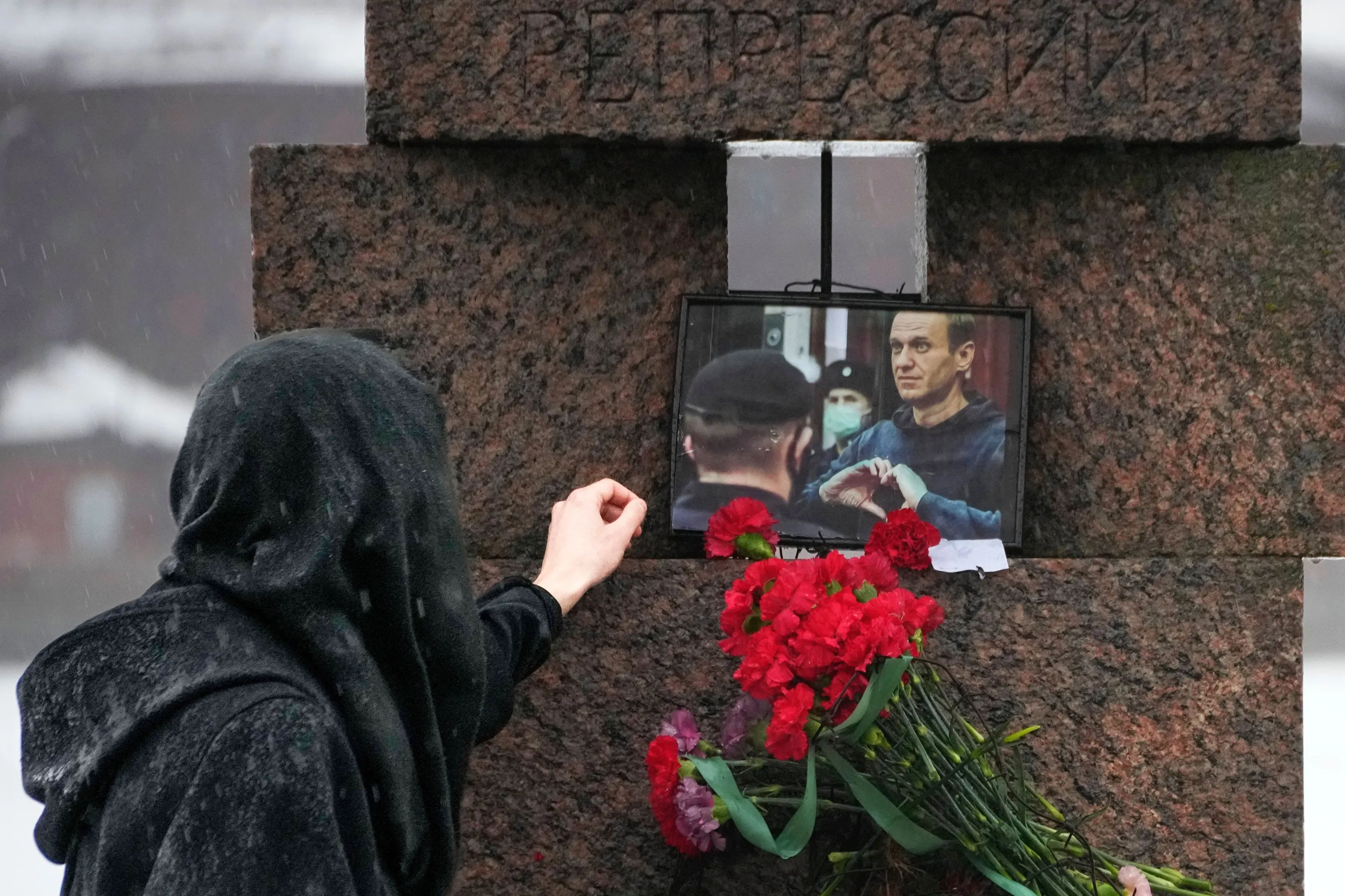 A woman touches a photo of Alexei Navalny after laying flowers paying the last respect to him at the Memorial to Victims of Political Repression in St. Petersburg, Russia on Saturday, February 17, 2024. Russian authorities say that Alexei Navalny, the fiercest foe of Russian President Vladimir Putin who crusaded against official corruption and staged massive anti-Kremlin protests, died in prison. He was 47. (Photo by Dmitri Lovetsky/AP Photo)