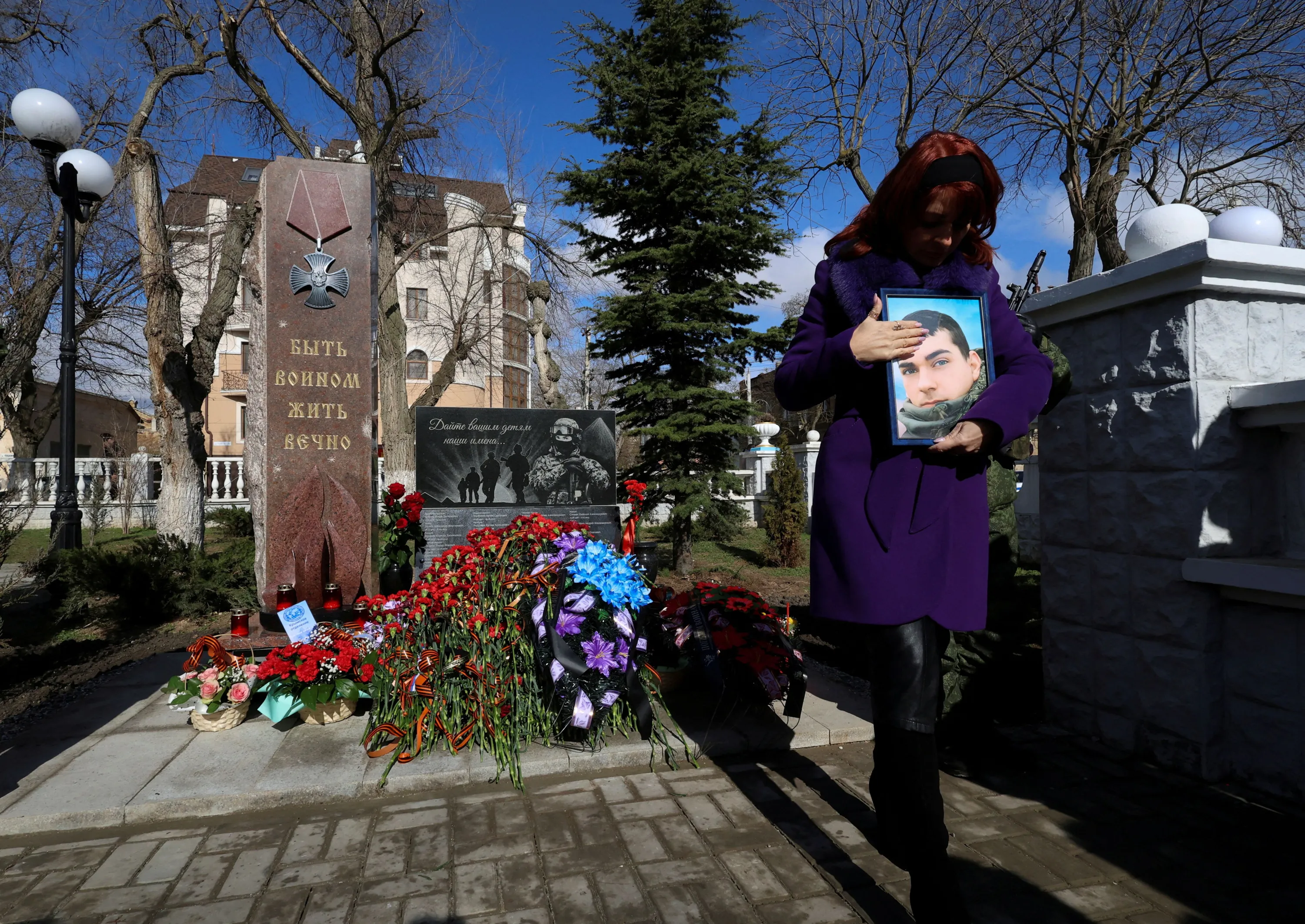 Natalia Patrashku holds a portrait of her son during the opening of the memorial to Russian service members killed during Russia-Ukraine conflict, in Yevpatoriya, Crimea on February 22, 2024. (Photo by Alexey Pavlishak/Reuters)