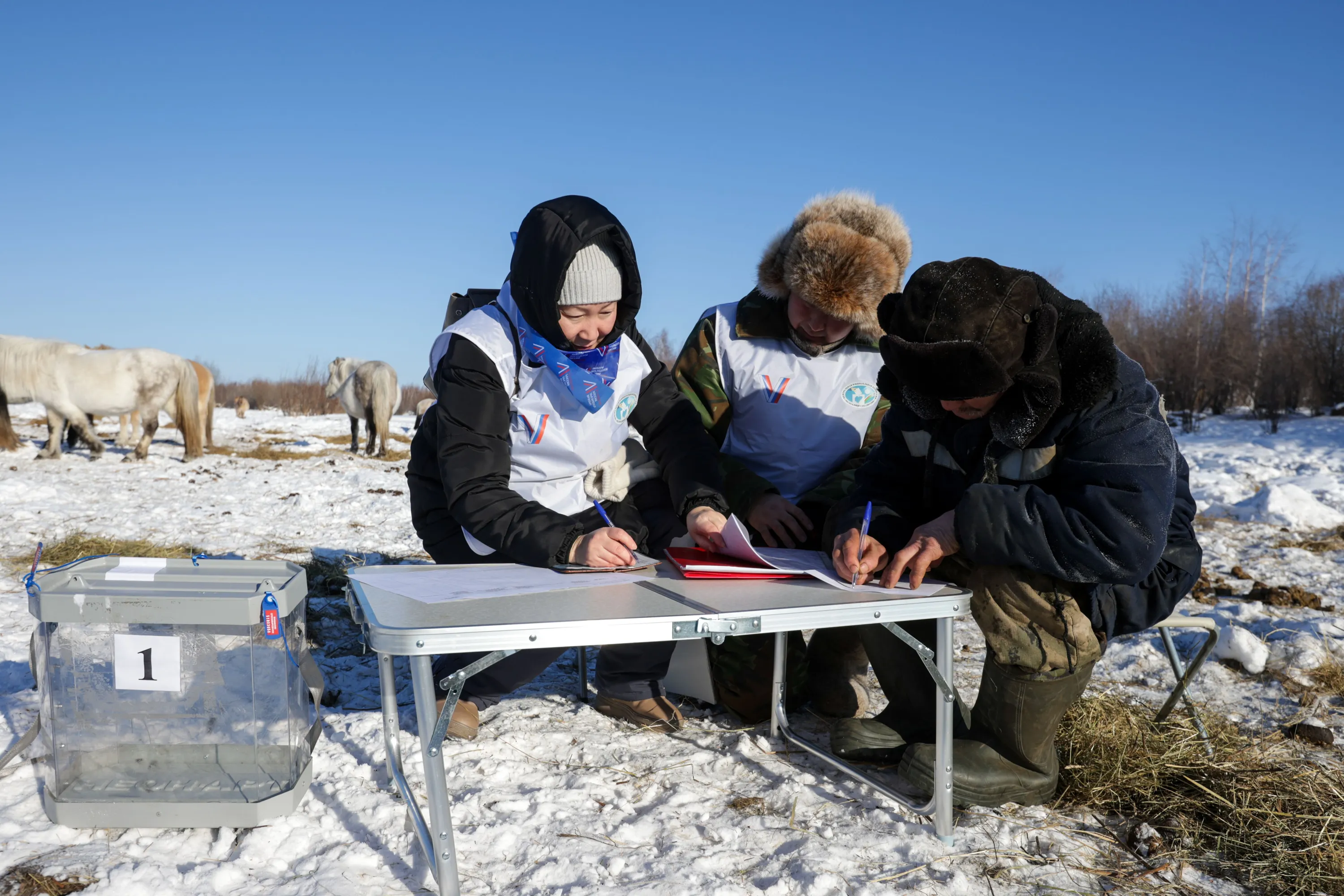 A man votes at an outdoor polling station in the village of Ulakhan-An, a remote area of the Republic of Sakha (Yakutia) on February 25, 2024, during an early voting held as part of the Russian presidential election scheduled for March 15-17, with LDPR Leader Leonid Slutsky, Russian Communist Party member Nikolai Kharitonov, New People Party member Vladislav Davankov, and incumbent president Vladimir Putin listed as candidates. (Photo by Vadim Skryabin/TASS)