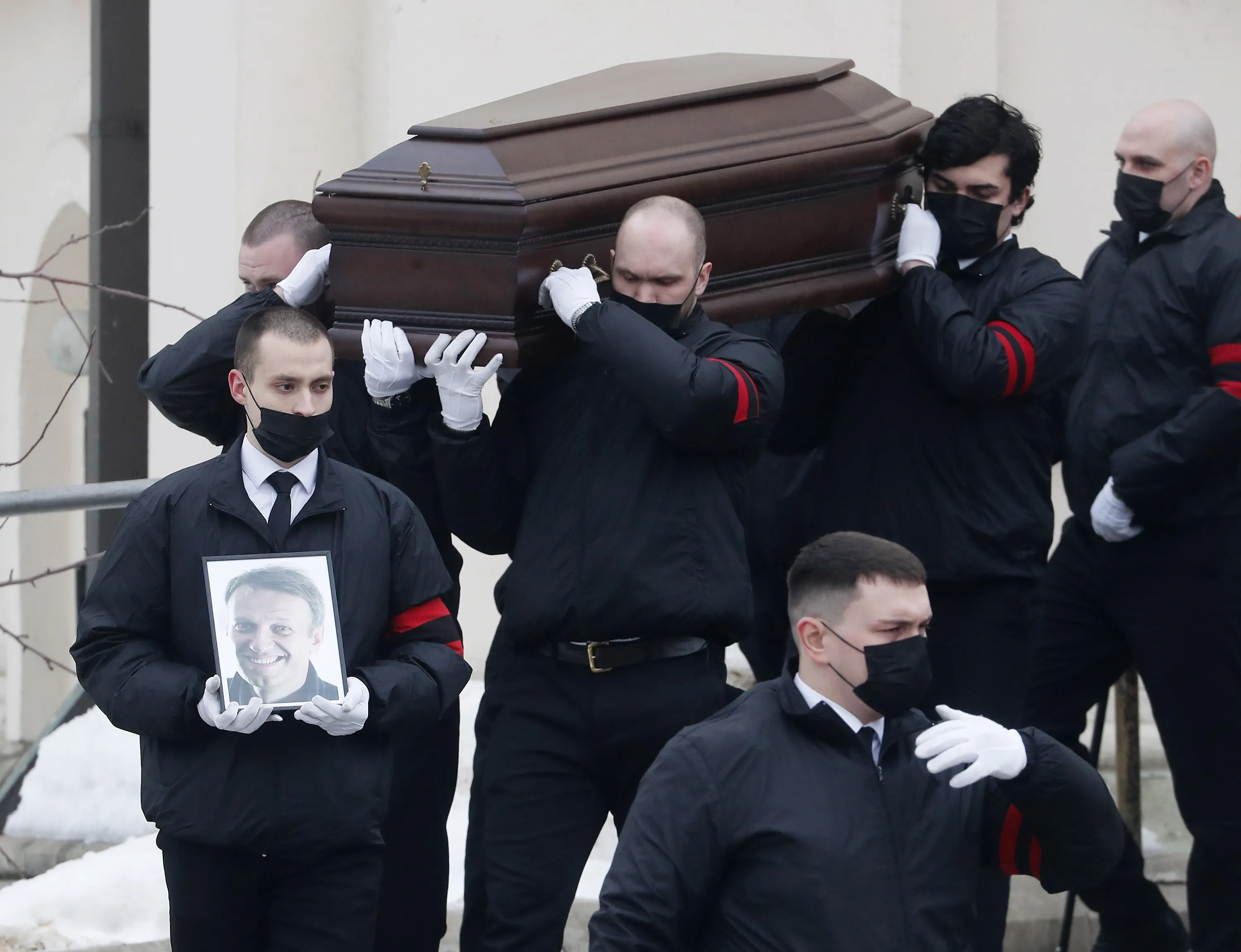Funeral service workers carry the coffin of late Russian opposition leader Alexei Navalny outside the Church of the Icon of the Mother of God, during his funerals in Moscow, Russia, 01 March 2024. Outspoken Kremlin critic Navalny died aged 47 in an arctic penal colony on 16 February 2024 after being transferred there in 2023. The colony is considered to be one of the world's harshest prisons. (Photo by Sergei Ilnitsky/EPA)