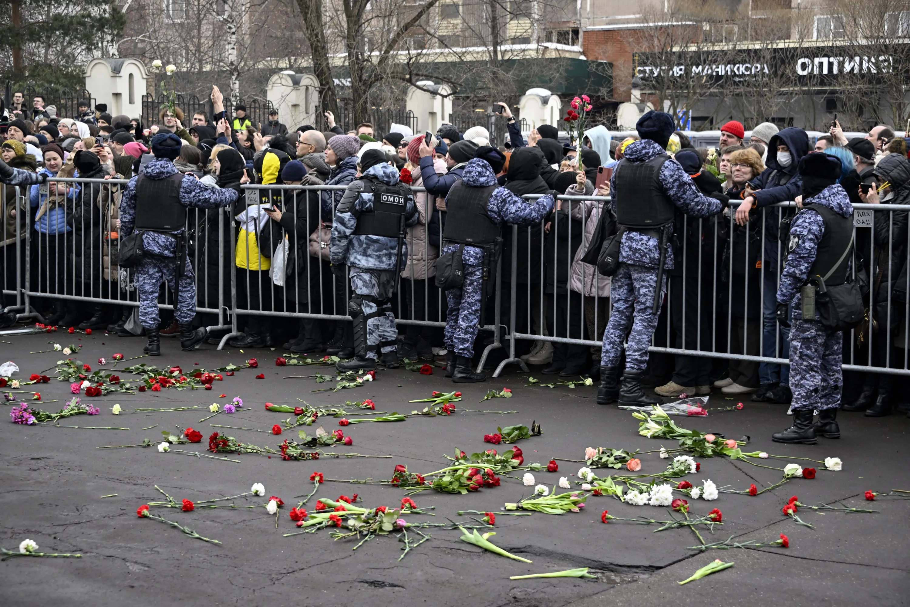 Mourners react as the hearse carrying the coffin of late Russian opposition leader Alexei Navalny leaves the Mother of God Quench My Sorrows church towards the Borisovo cemetery for Navalny's burial, in Moscow's district of Maryino on March 1, 2024. (Photo by Alexander Nemenov/AFP Photo)