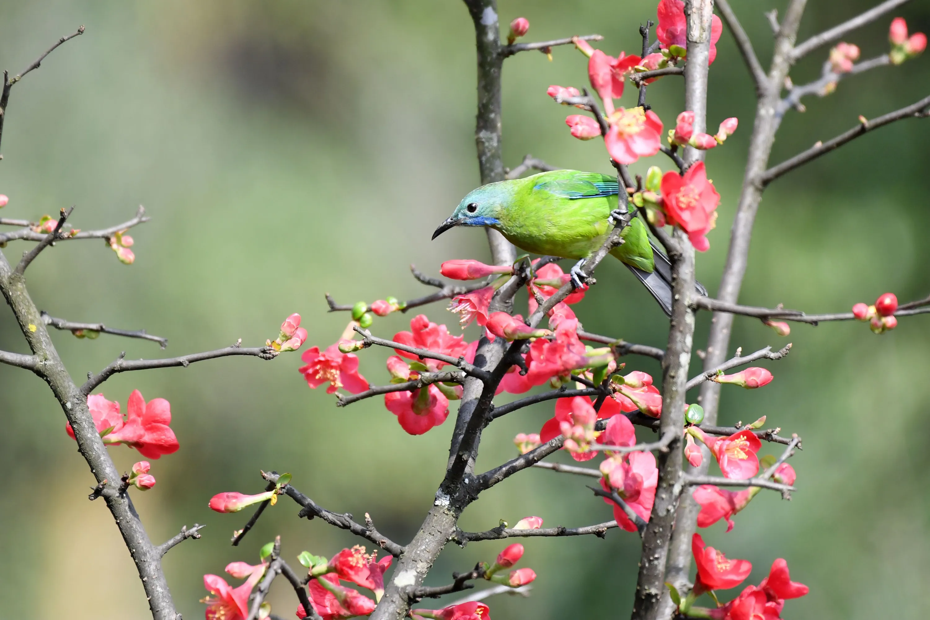 An orange-bellied leafbird is resting on a crabapple flower branch in Nanzhu Forest Park in Renhuai, China, on February 16, 2024. (Photo by Costfoto/NurPhoto/Rex Features/Shutterstock)