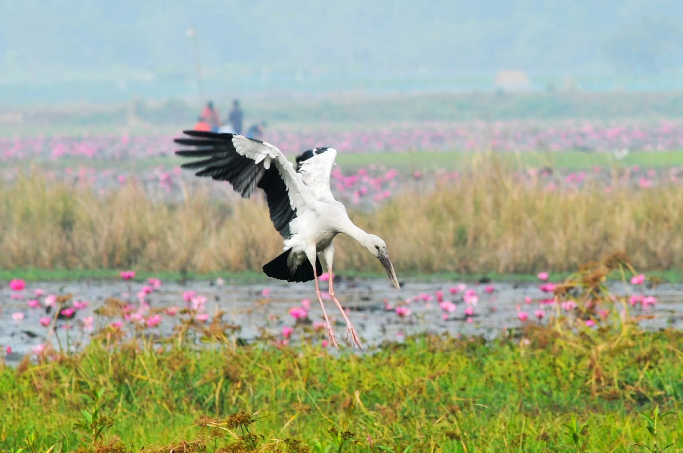 An openbill stork comes in to land at a wetland near Sylhet, Bangladesh on February 3, 2024. (Photo by Md Rafayat Haque Khan/ Eyepix Group/Rex Features/Shutterstock)