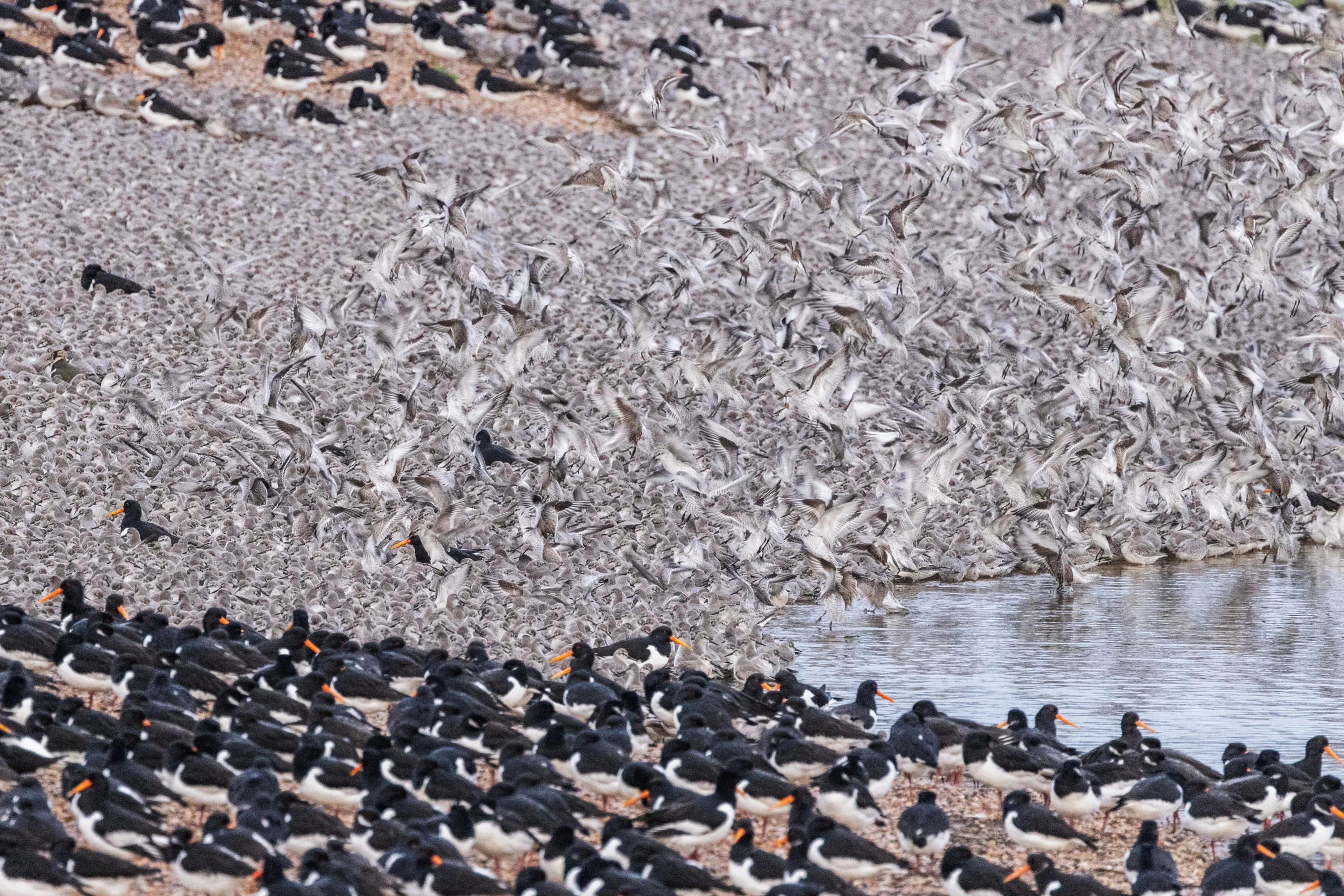 High tide in the Wash, a “globally significant” feeding ground for winter waders, forces thousands of knot, bar-tailed godwit and oystercatcher to roost on a lagoon at the RSPB Snettisham nature reserve in Norfolk in the first decade of February 2024. (Photo by Jack Hill/The Times)