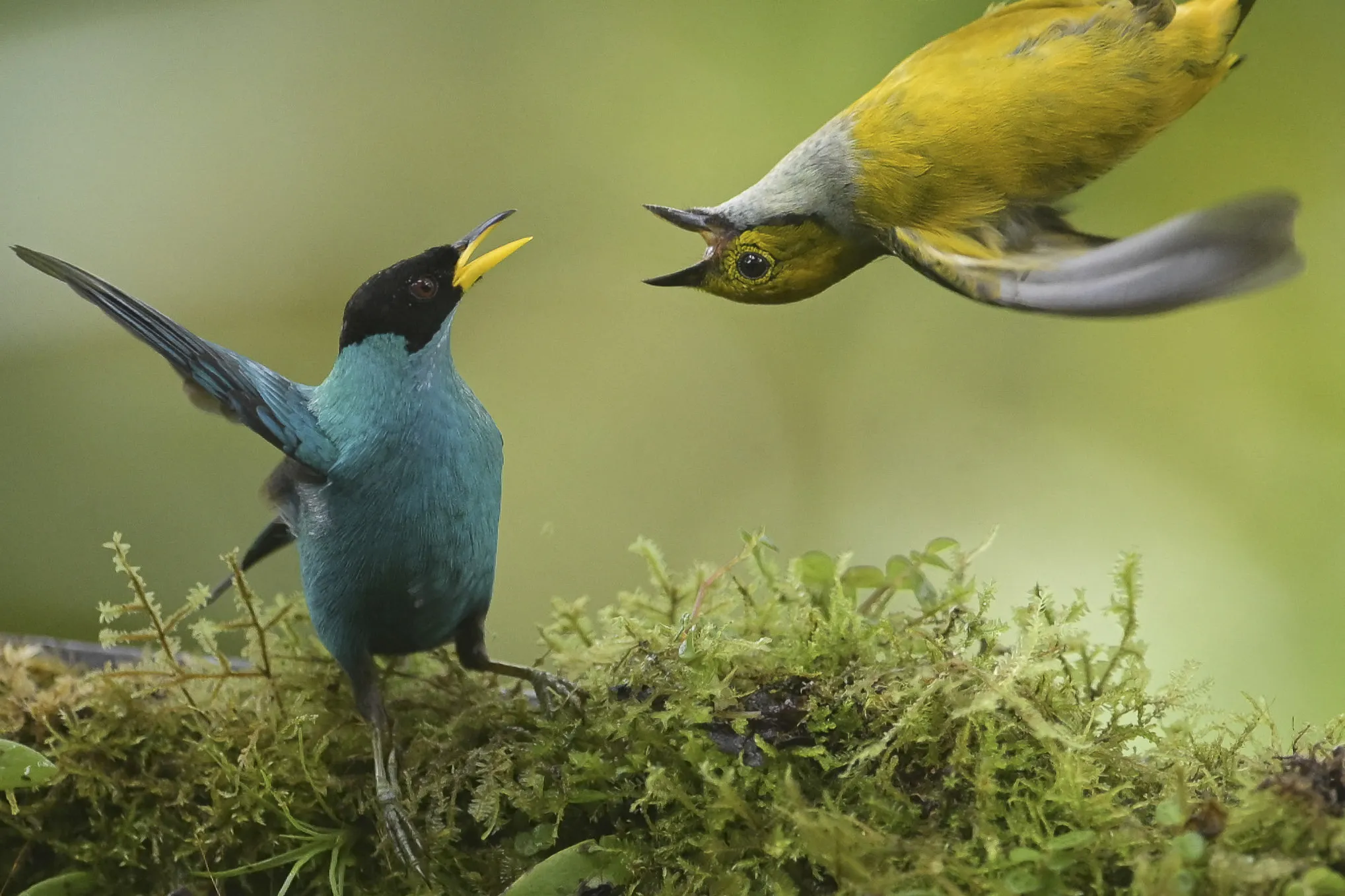 A Chlorophanes spiza tangara (L) and a Silver-throated tanager are pictured in Dagua, department of Valle del Cauca, Colombia, during the 2024 Colombian Bird Fair on February 15, 2024. The 2024 Colombian Bird Fair takes place until February 18. (Photo by Joaquin Sarmiento/AFP Photo)