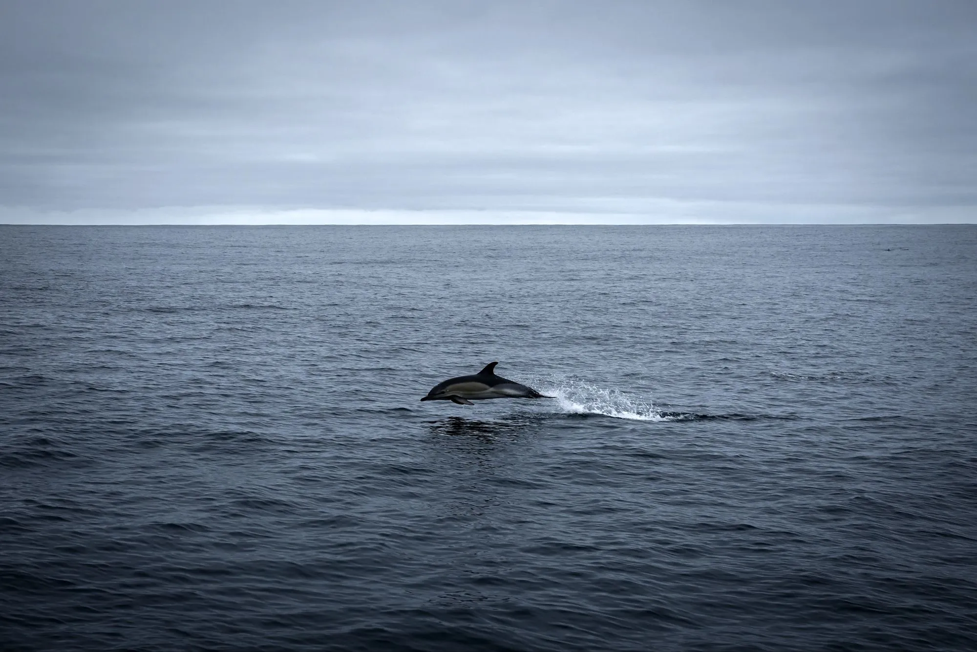 This photograph taken on February 20, 2024 shows a dolphin jumping in the waters of the Atlantic Ocean, some 180kms west of the coast of La Rochelle, western France. (Photo by Philippe Lopez/AFP Photo)