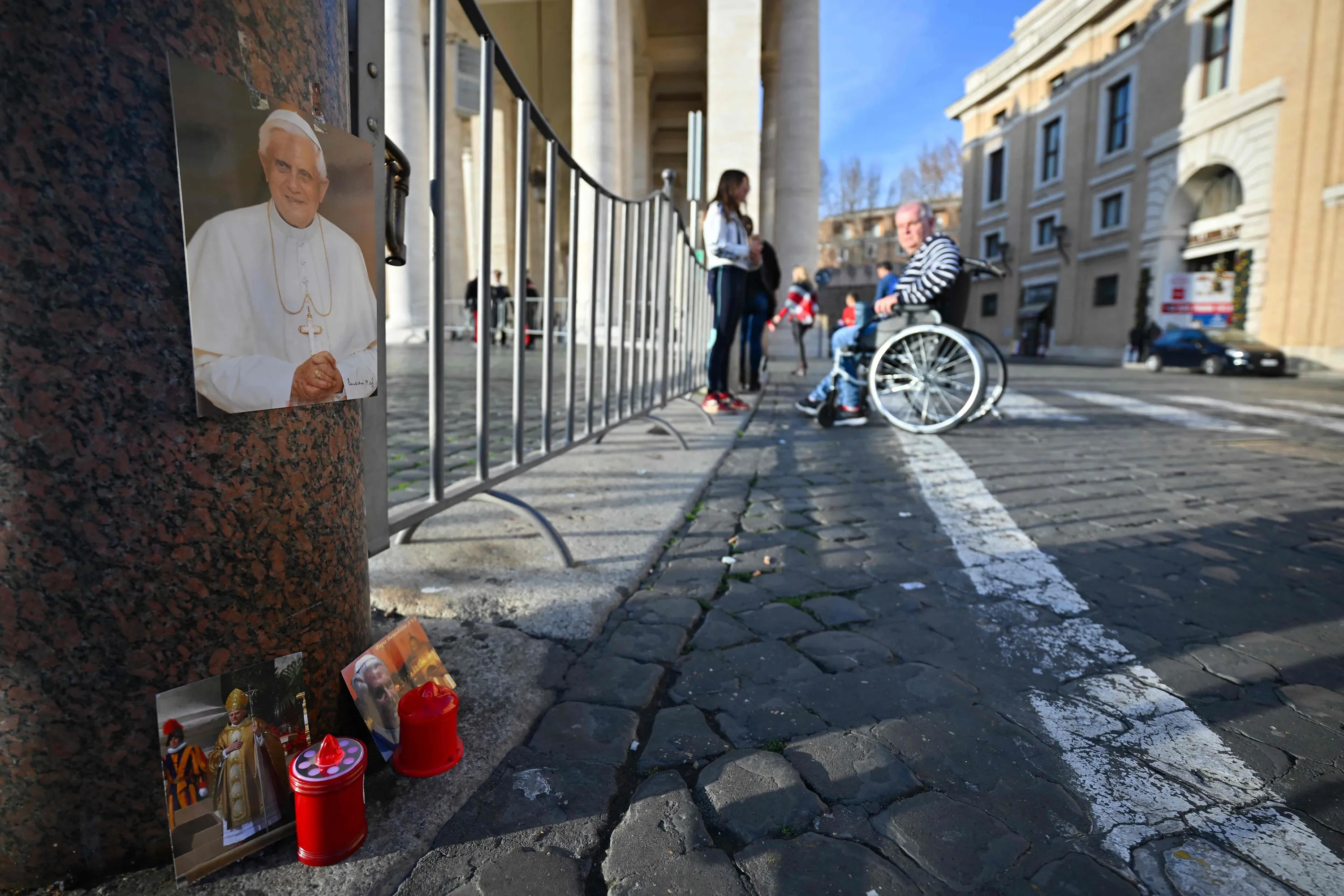 People gather following the announcement of the death of former pope Benedict XVI on St Peter's Square, at The Vatican, on December 31, 2022. Former Pope Benedict XVI has died at the age of 95, the Vatican announced on December 31, 2022, almost a decade after he became the first pontiff to resign in six centuries. The German pope emeritus, whose birth name was Joseph Ratzinger, had been living a quiet life in a former convent inside the Vatican grounds since his shock decision to step down in February 2013. (Photo by Filippo Monteforte/AFP Photo)